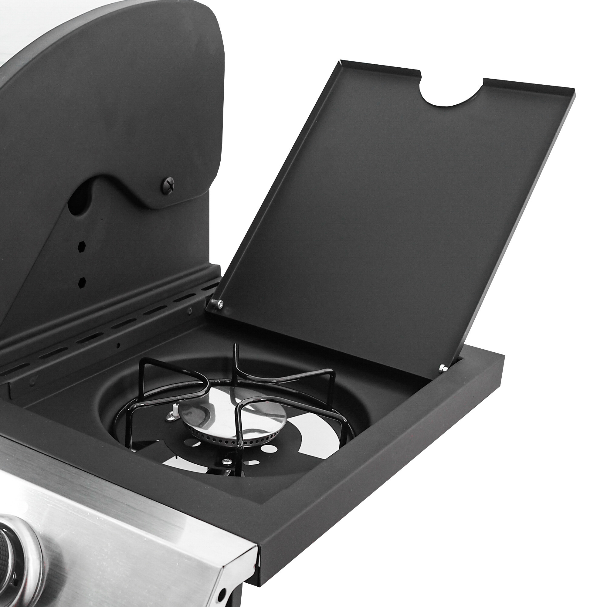 Praktischer verschließbarer Deckel des Seitenbrenners ermöglicht bei geschlossenem Zustand die Nutzung als Arbeits- oder Ablagefläche.