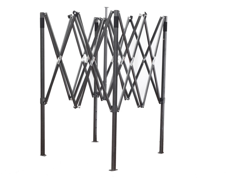 Verkaufsstand mit schnell aufklappbarer Scherenkonstruktion, ausgestattet mit drei abnehmbaren Seitenwänden, die mit Klettverschluss befestigt sind, und einer dreistufigen Höhenverstellung.