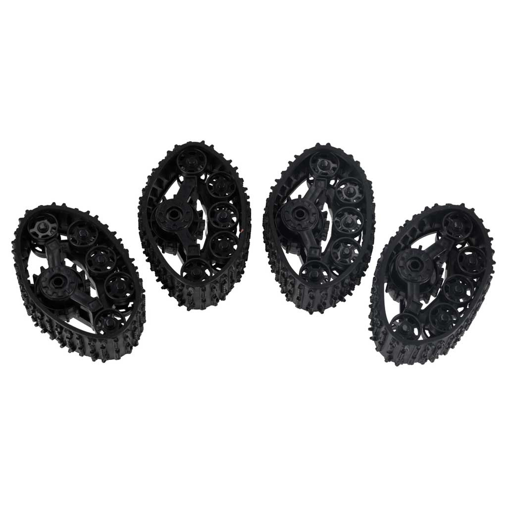 - Das Auto hat Gummiketten und Gummireifen für das Fahren auf verschiedenen Untergründen.