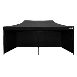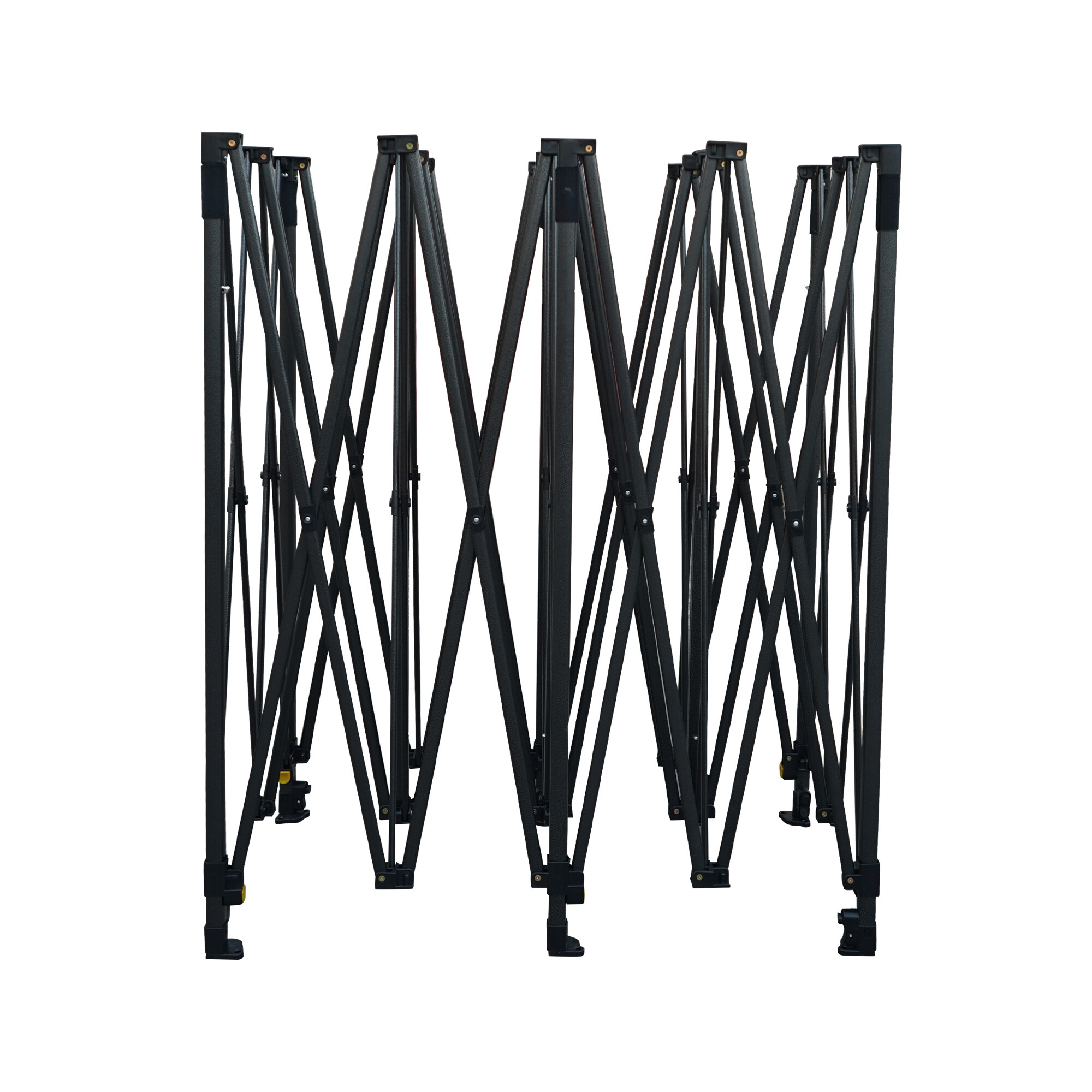 Verkaufsstand mit schnell faltbarer Scherenkonstruktion, ausgestattet mit drei seitlichen abnehmbaren Paneelen, die mit Klettverschluss befestigt sind, und einer dreistufigen Höhenverstellmöglichkeit.