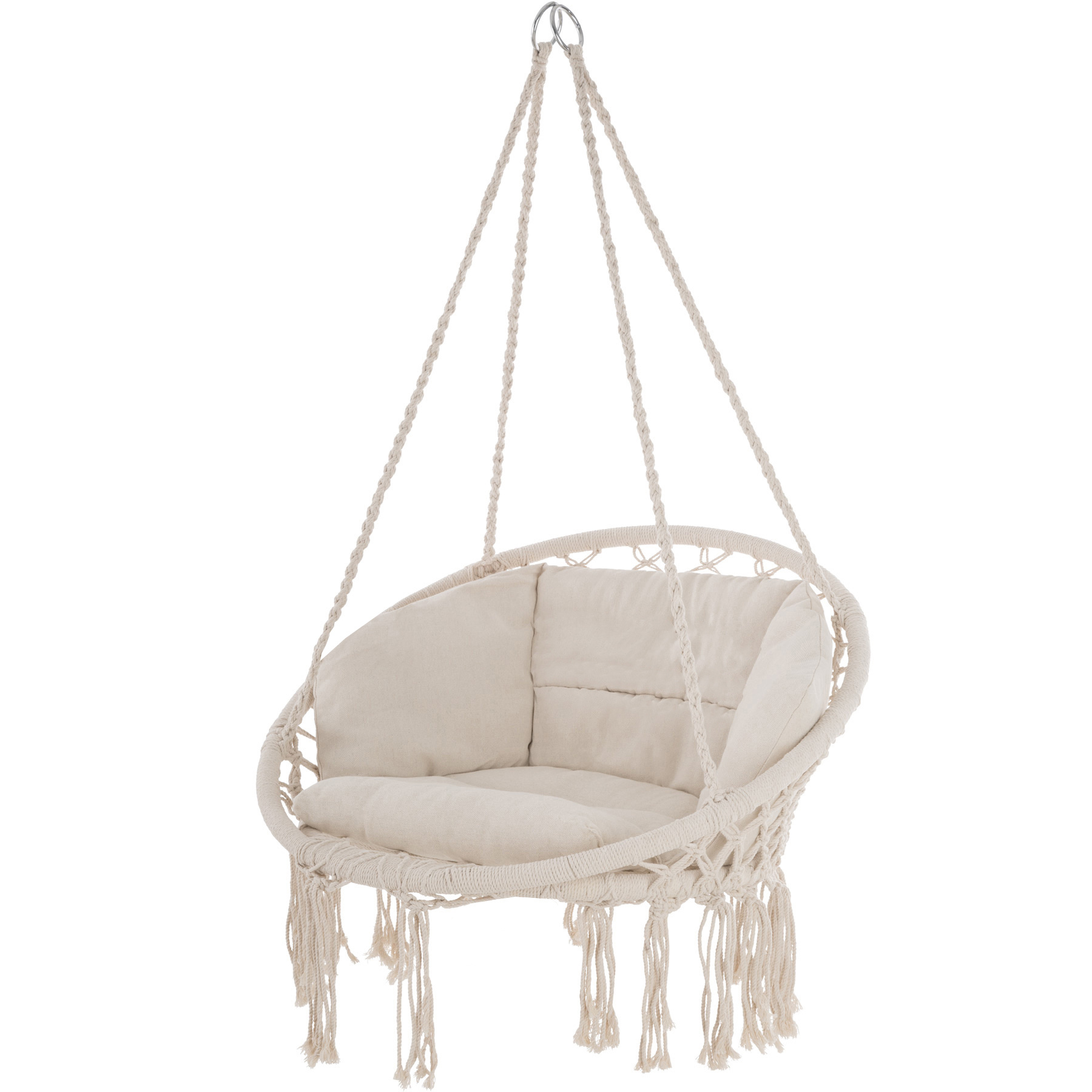 Der Sitzbereich ist mit stabilen Metallringen befestigt, wodurch der Stuhl fast überall aufgehängt werden kann. Der Sitzteil ist aus festem geflochtenem Seil gefertigt.