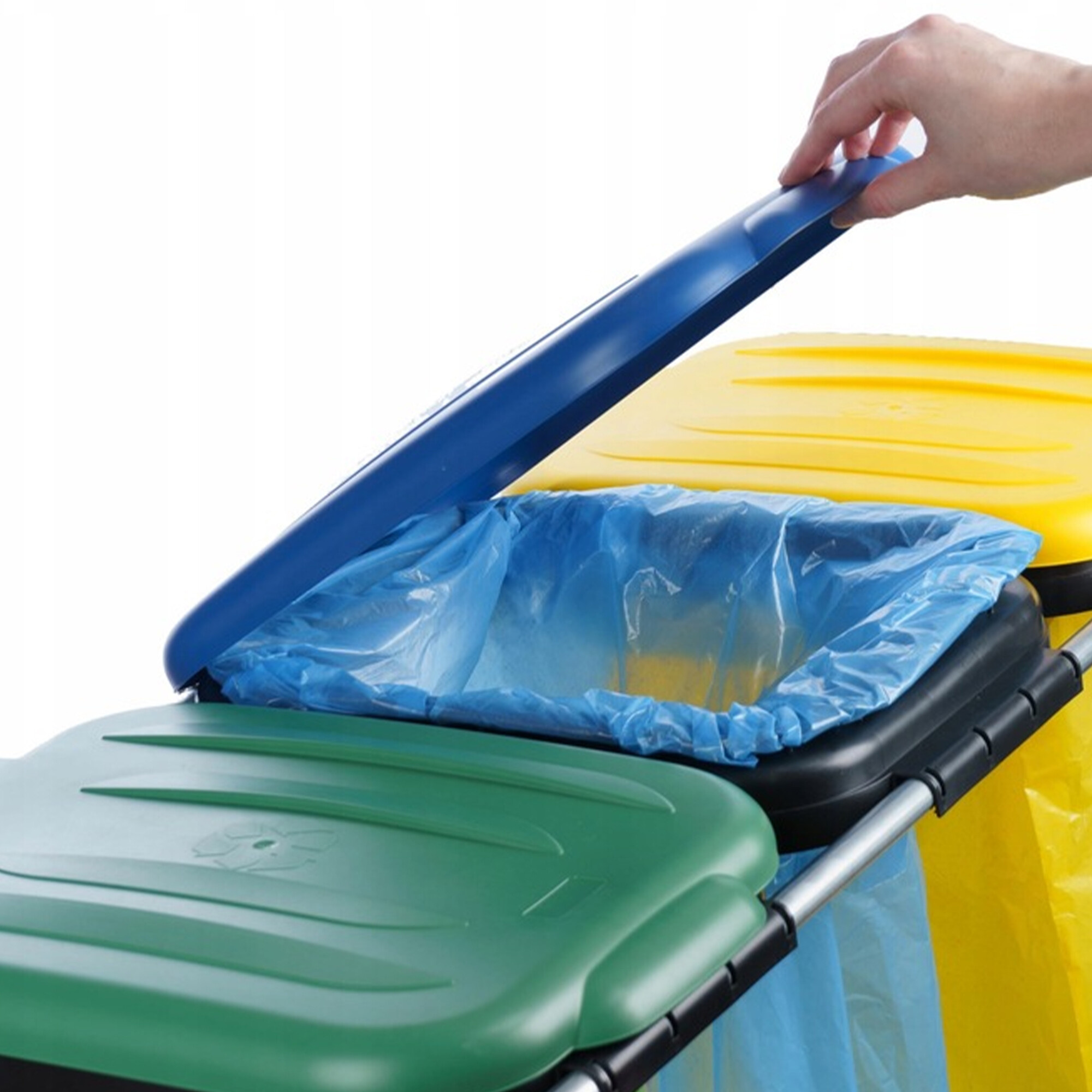 Der faltbare Müllsackständer ist eine praktische Lösung für jeden, der Abfall übersichtlich und effizient sortieren muss. Farbige Deckel in den Farben Gelb, Grün und Blau entsprechen den europäischen Standards für die Abfalltrennung und ermöglichen eine schnelle Erkennung des richtigen Behälters.