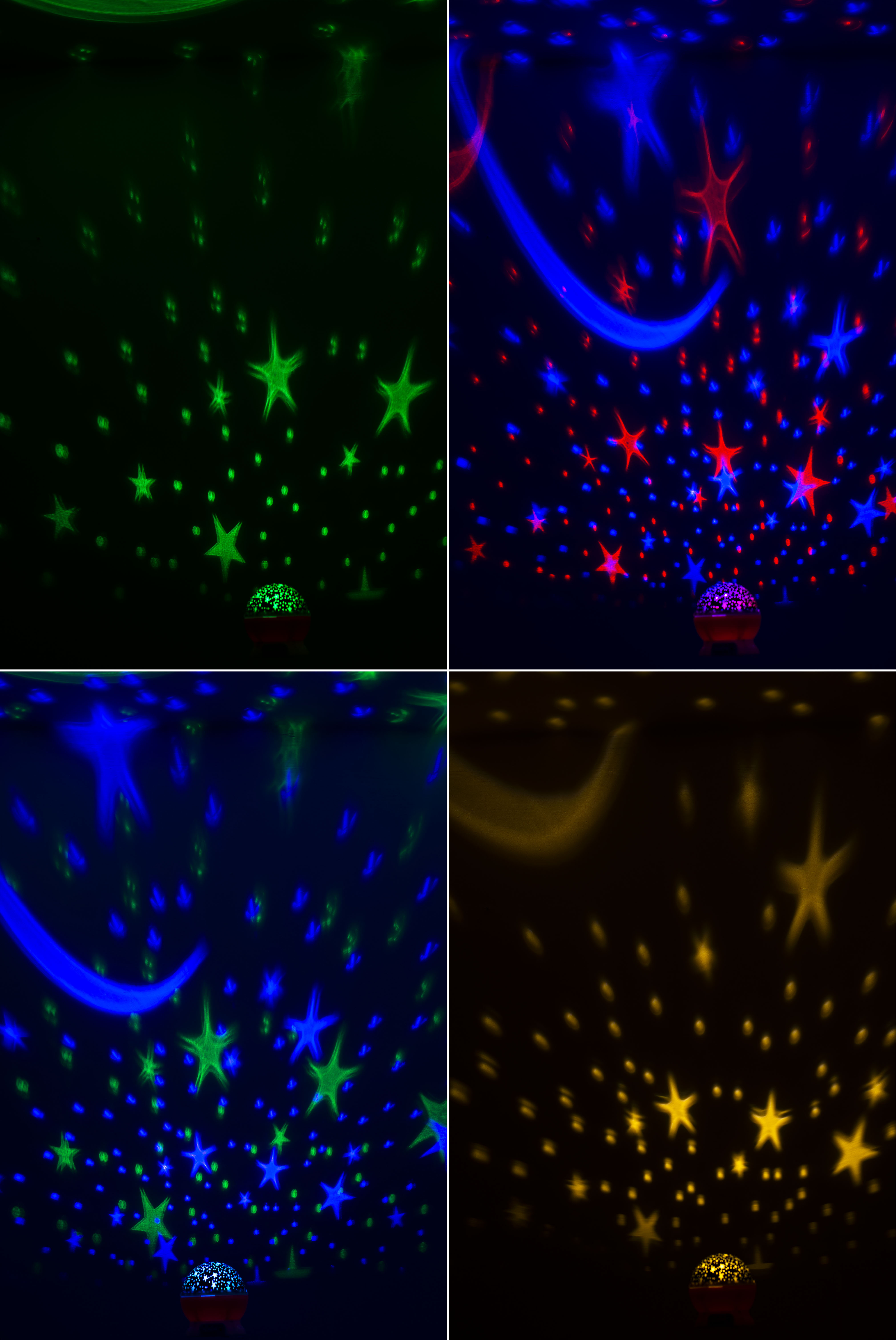 Die Lampe zeigt Projektionen des Sternenhimmels in verschiedenen Farben und Modi, wie z. B. sanfte Farbwechsel oder das Ausschalten einzelner Farben.