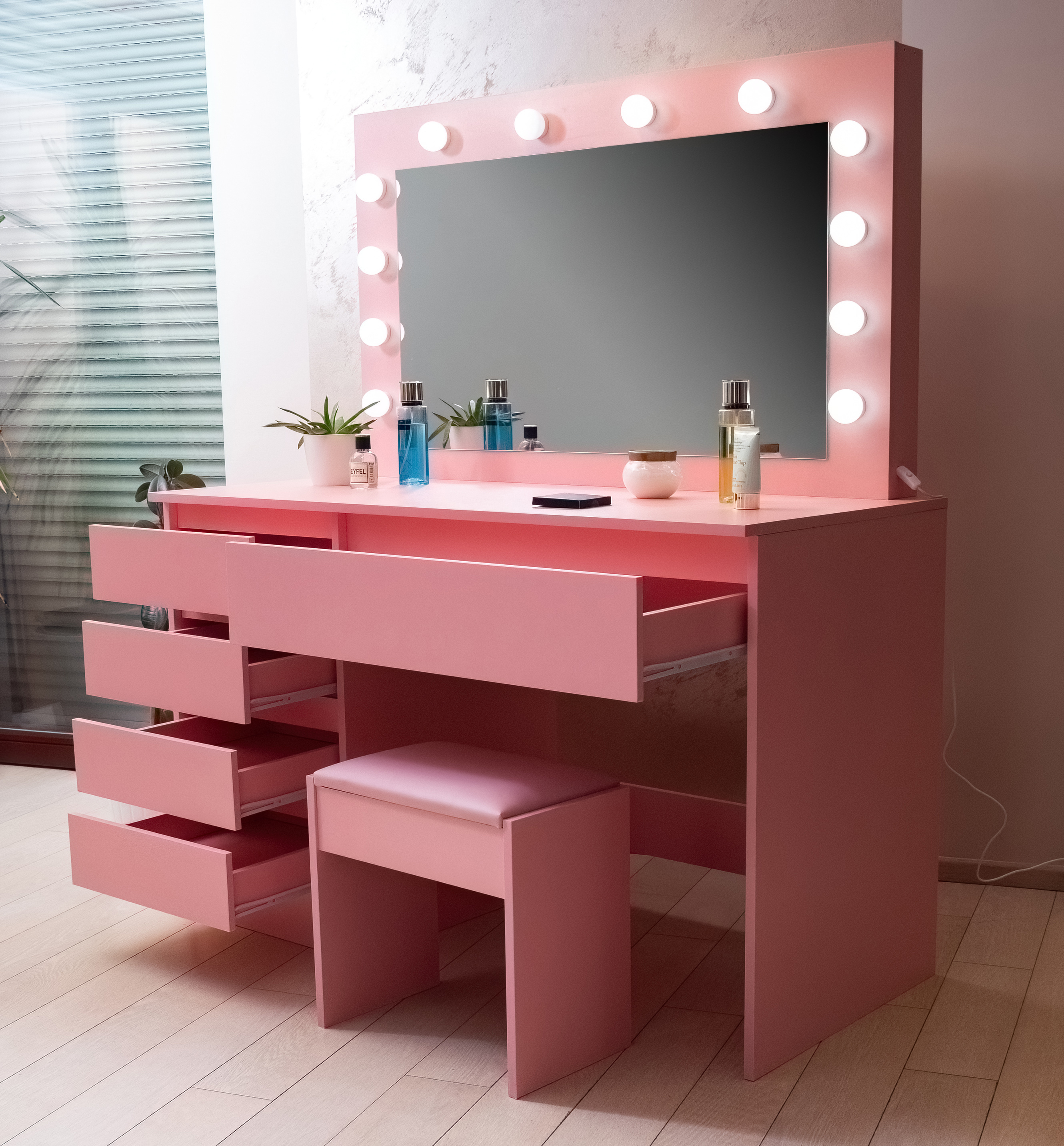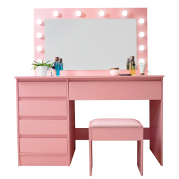 Der Schminktisch besteht aus einer massiven laminierten Spanplatte mit einer Melaminoberfläche, die sich durch ihre Kratzfestigkeit auszeichnet.