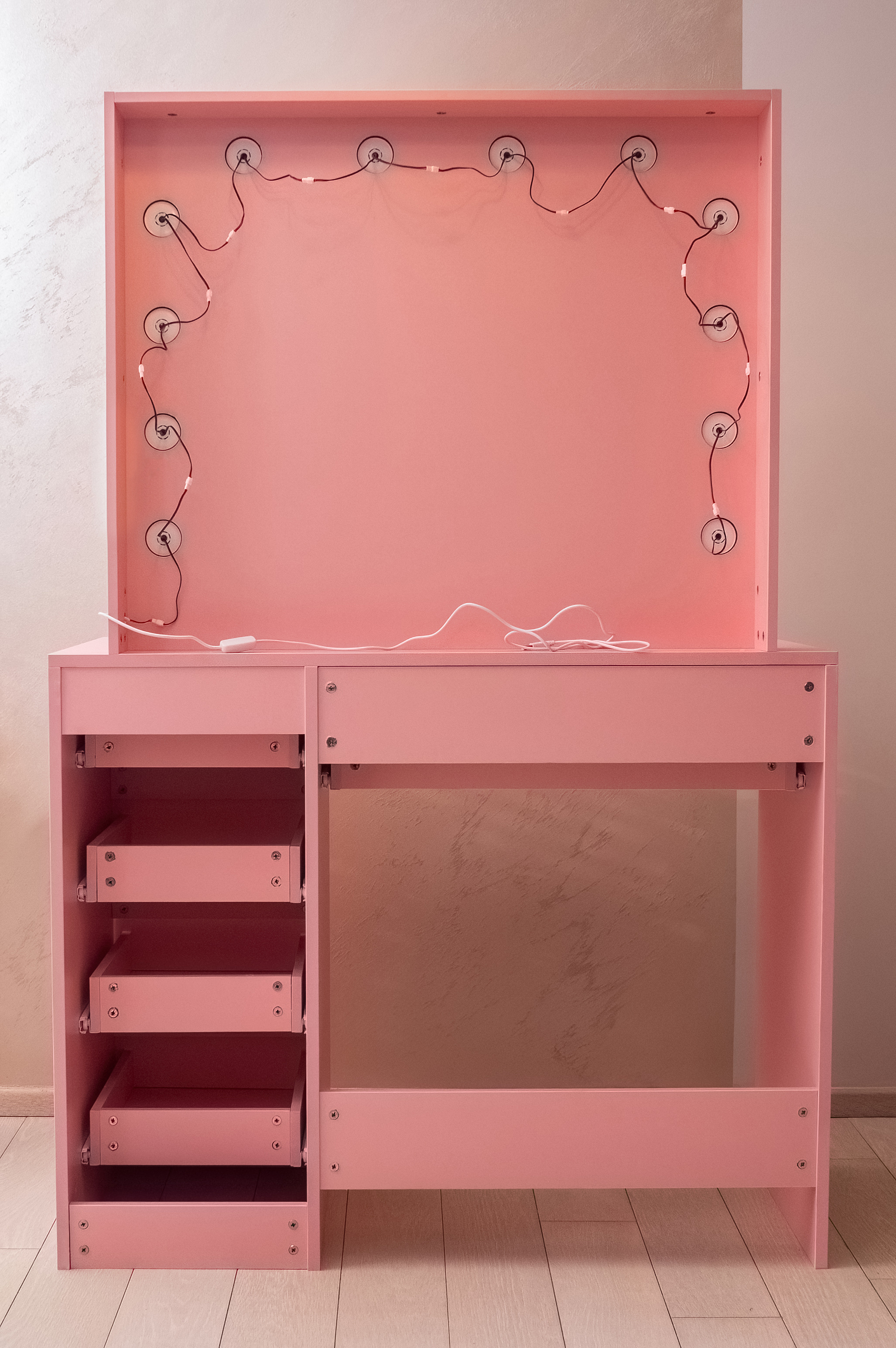 Der Schminktisch besteht aus einer massiven laminierten Spanplatte mit einer Melaminoberfläche, die sich durch ihre Kratzfestigkeit auszeichnet.