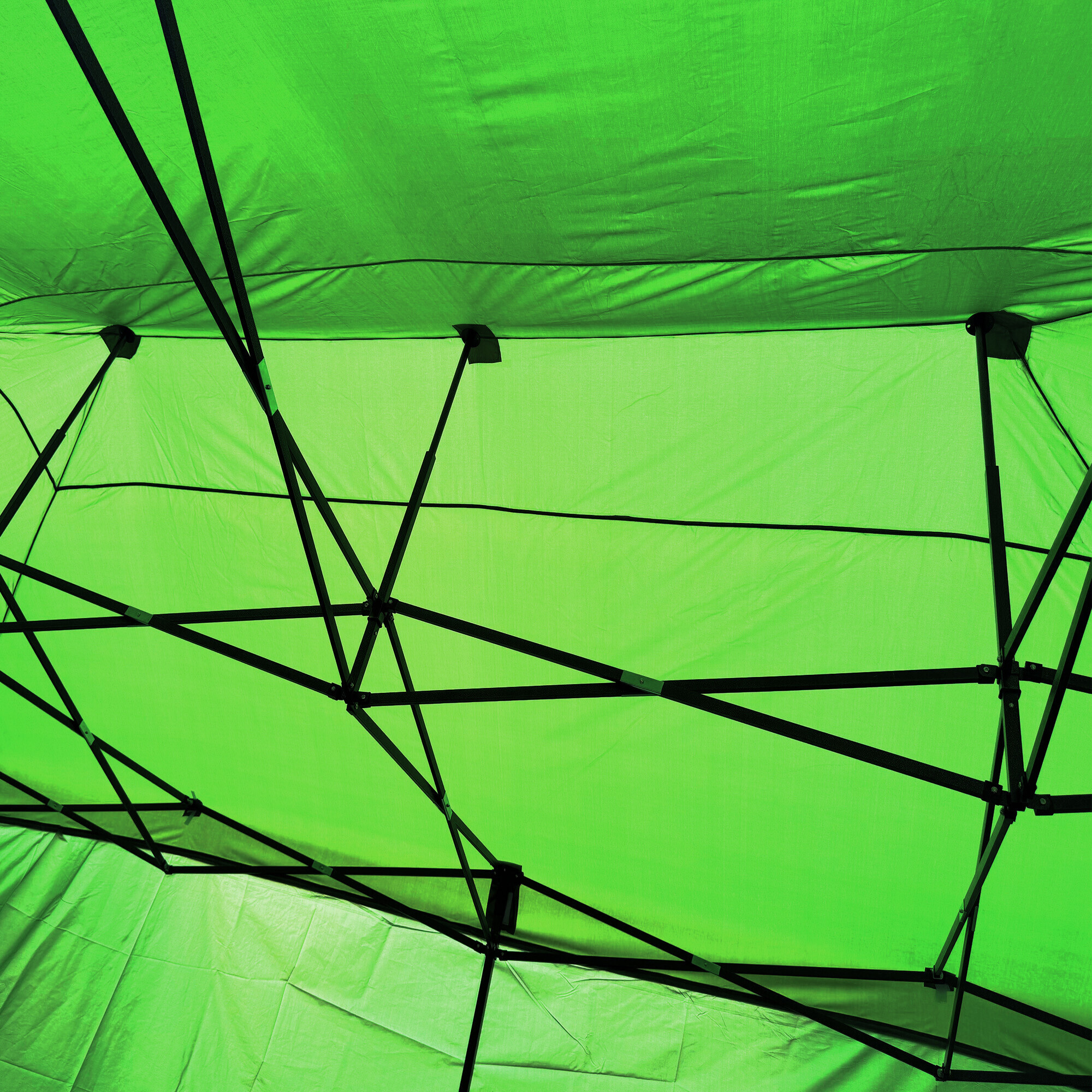 Bei diesem Modell ist zusätzlich in der Mitte der Konstruktion ein zusätzlicher mittlerer Fuß platziert, der der gesamten Fläche zusätzliche Unterstützung bietet. Dank dessen ist der Rahmen auch bei größerer Belastung stabil und gleichzeitig wird ein Durchbiegen des Daches auf einer so großen Fläche verhindert. Jedes Bein endet mit einem Fuß, der die Möglichkeit bietet, im Boden verankert zu werden, was die Gesamtstabilität des Standes auch unter anspruchsvolleren Bedingungen erheblich erhöht.
