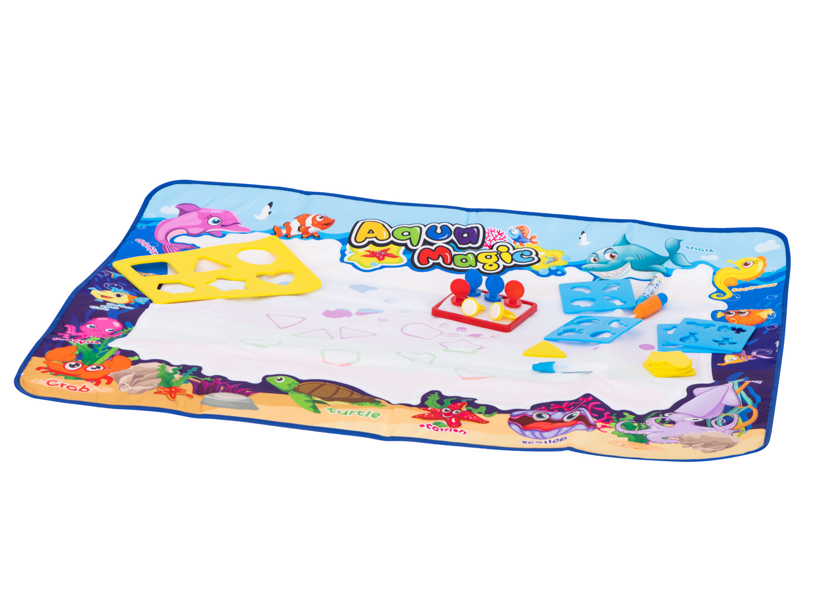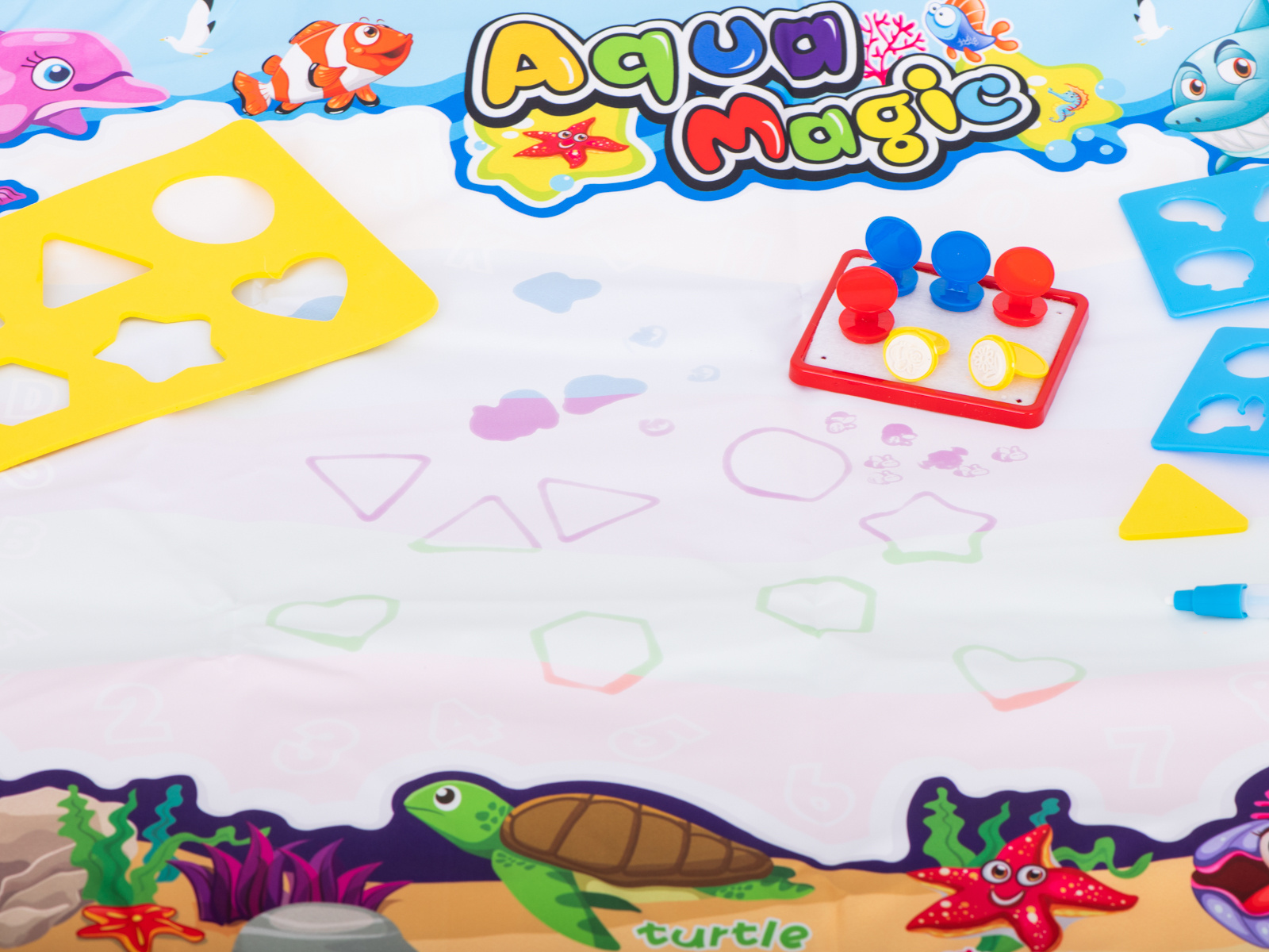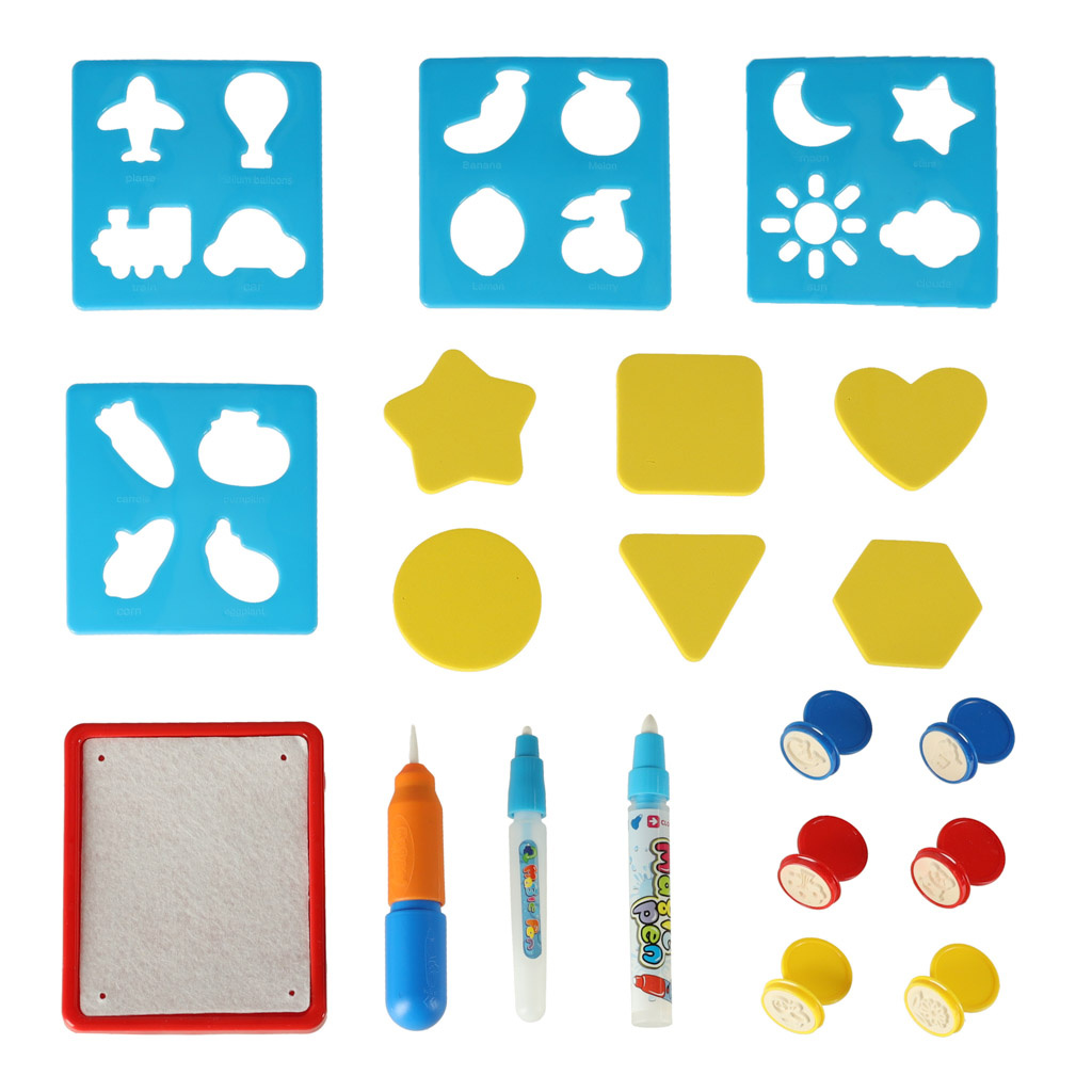 Nach dem Befeuchten mit Wasser erscheint ein farbiges Bild auf der Matte. mit den beiliegenden Schablonen können verschiedene Formen auf der Oberfläche nachgezeichnet werden. Darüber hinaus gibt es Stempel, die nach dem Einweichen in Wasser auf die Oberfläche aufgedruckt werden können.