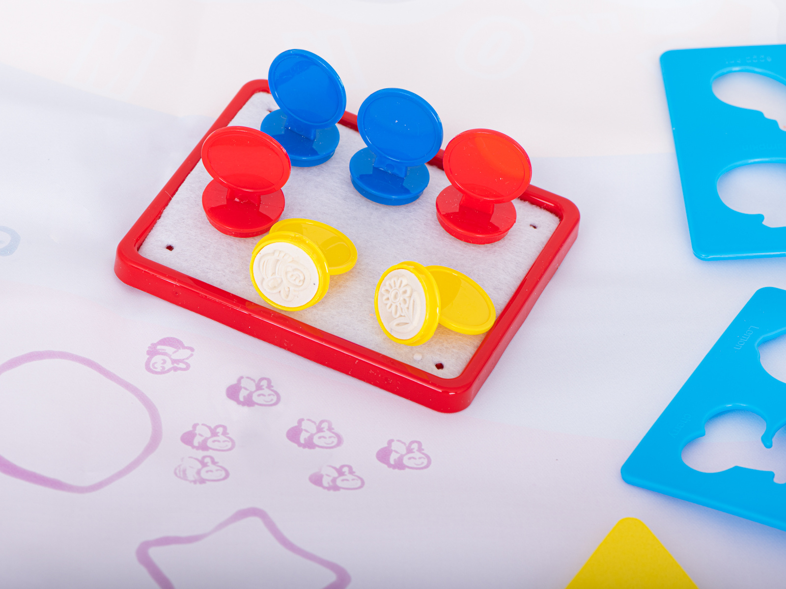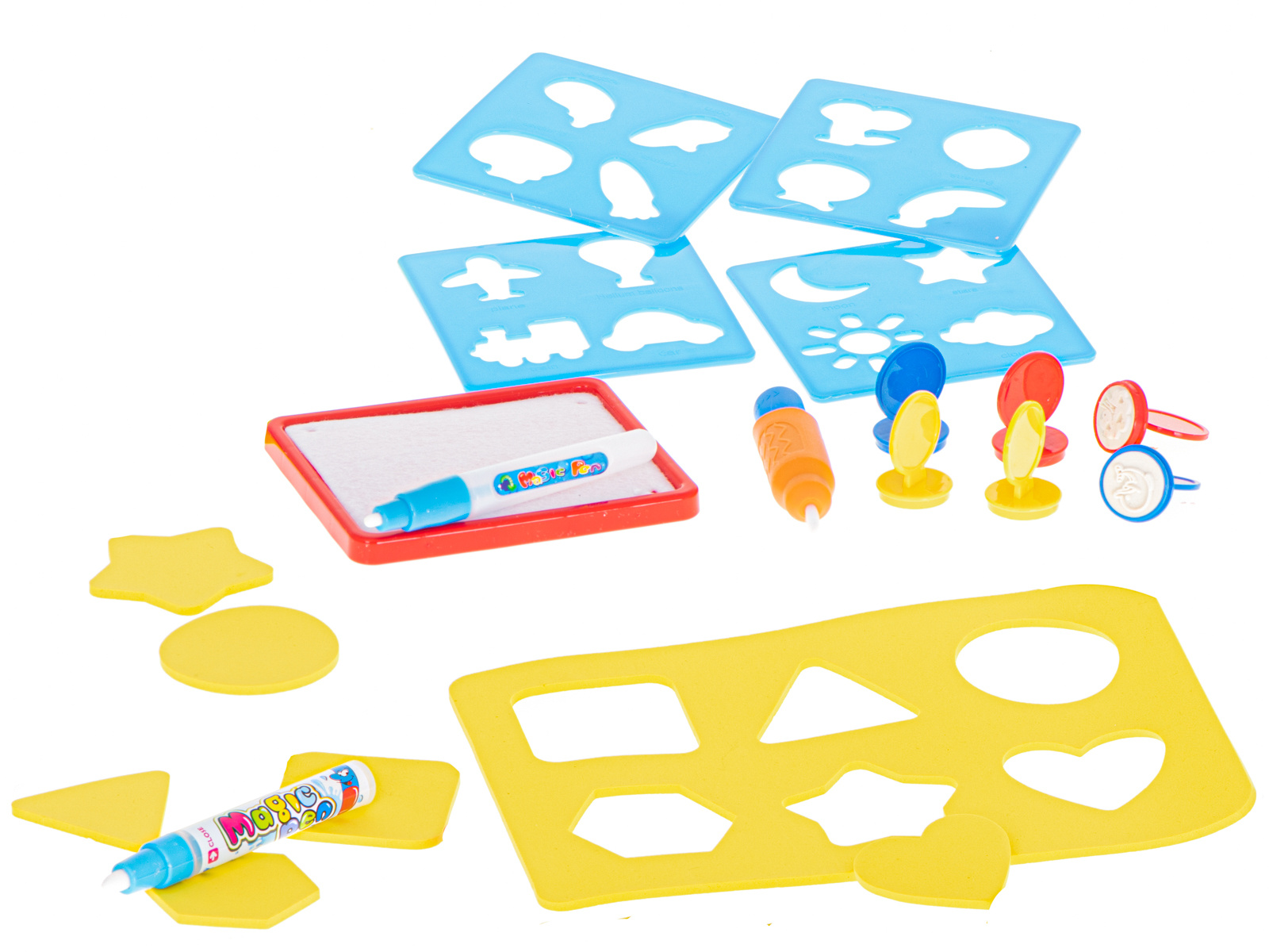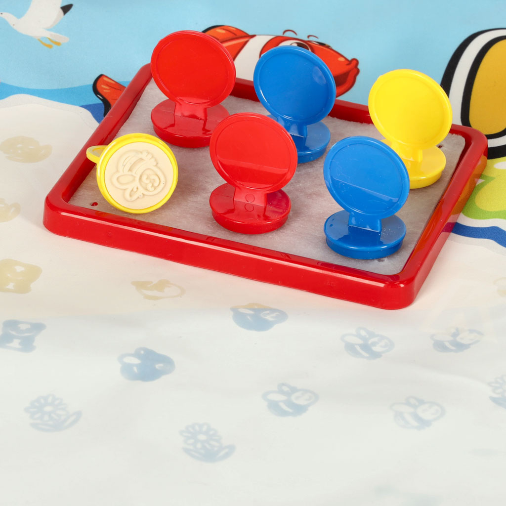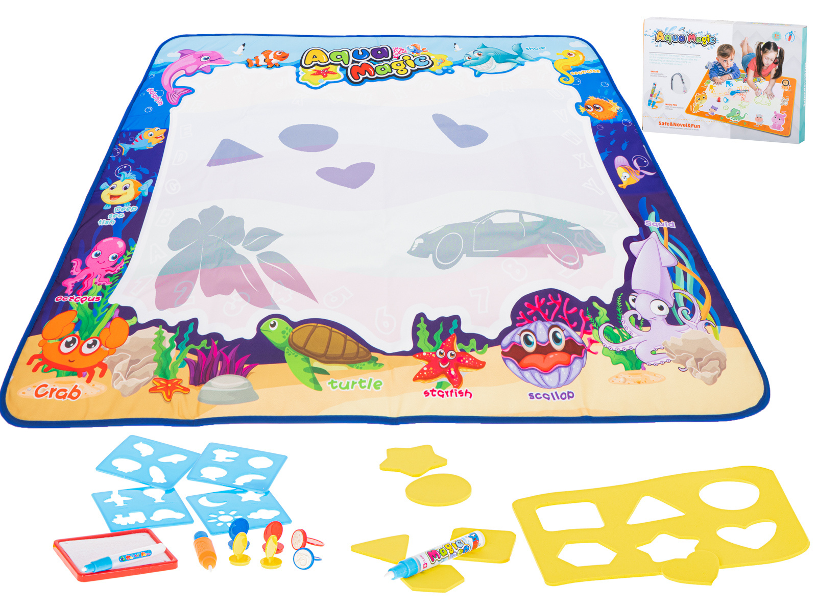 Nach dem Befeuchten mit Wasser erscheint ein farbiges Bild auf der Matte. mit den beiliegenden Schablonen können verschiedene Formen auf der Oberfläche nachgezeichnet werden. Darüber hinaus gibt es Stempel, die nach dem Einweichen in Wasser auf die Oberfläche aufgedruckt werden können.