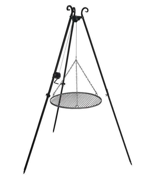 Die Höhe des Grillrostes lässt sich mit Hilfe der Umlenkrolle am oberen Ende des Dreibeins und der Haken leicht einstellen. Der Grill mit einem Durchmesser von 60 cm ermöglicht das Grillen für größere Gruppen.