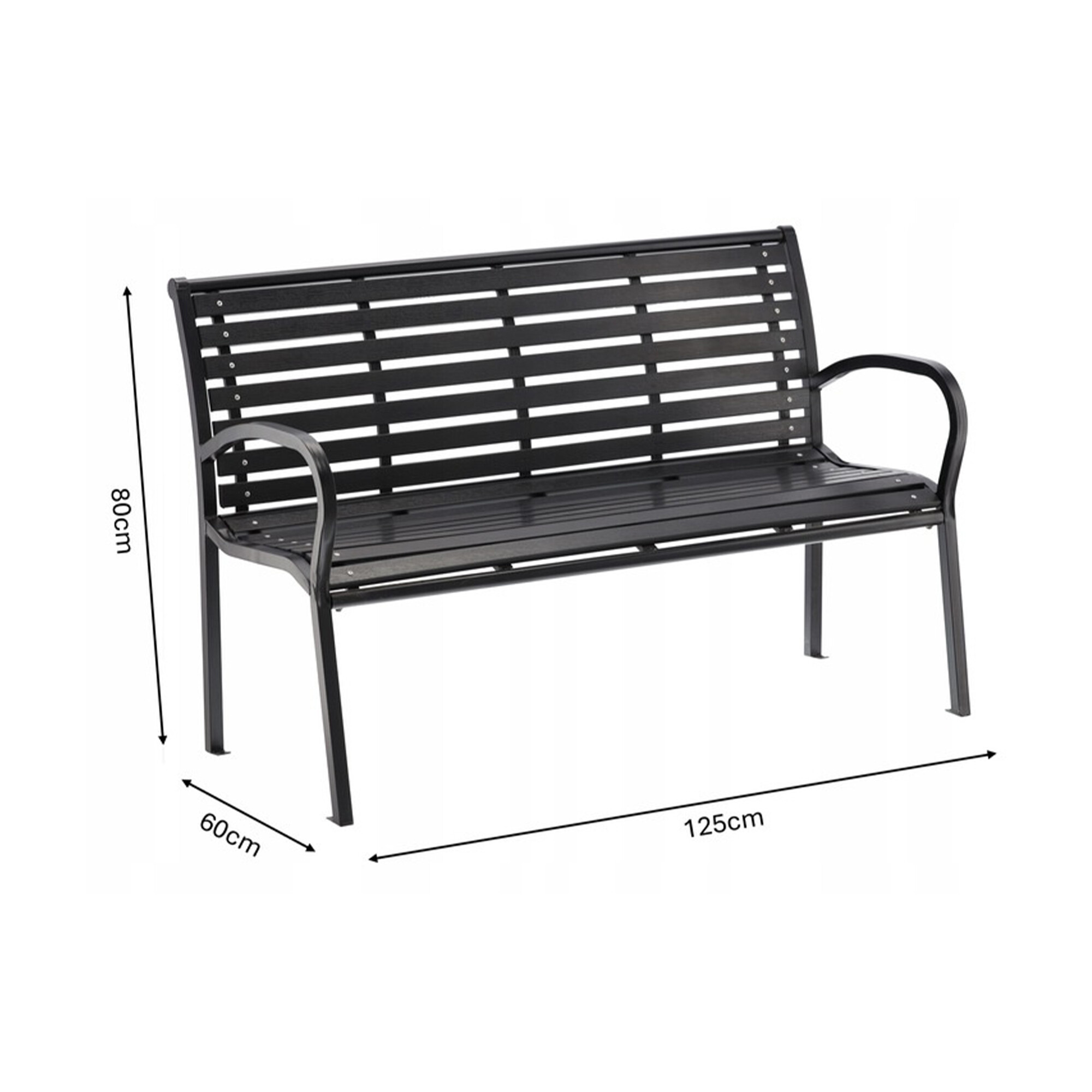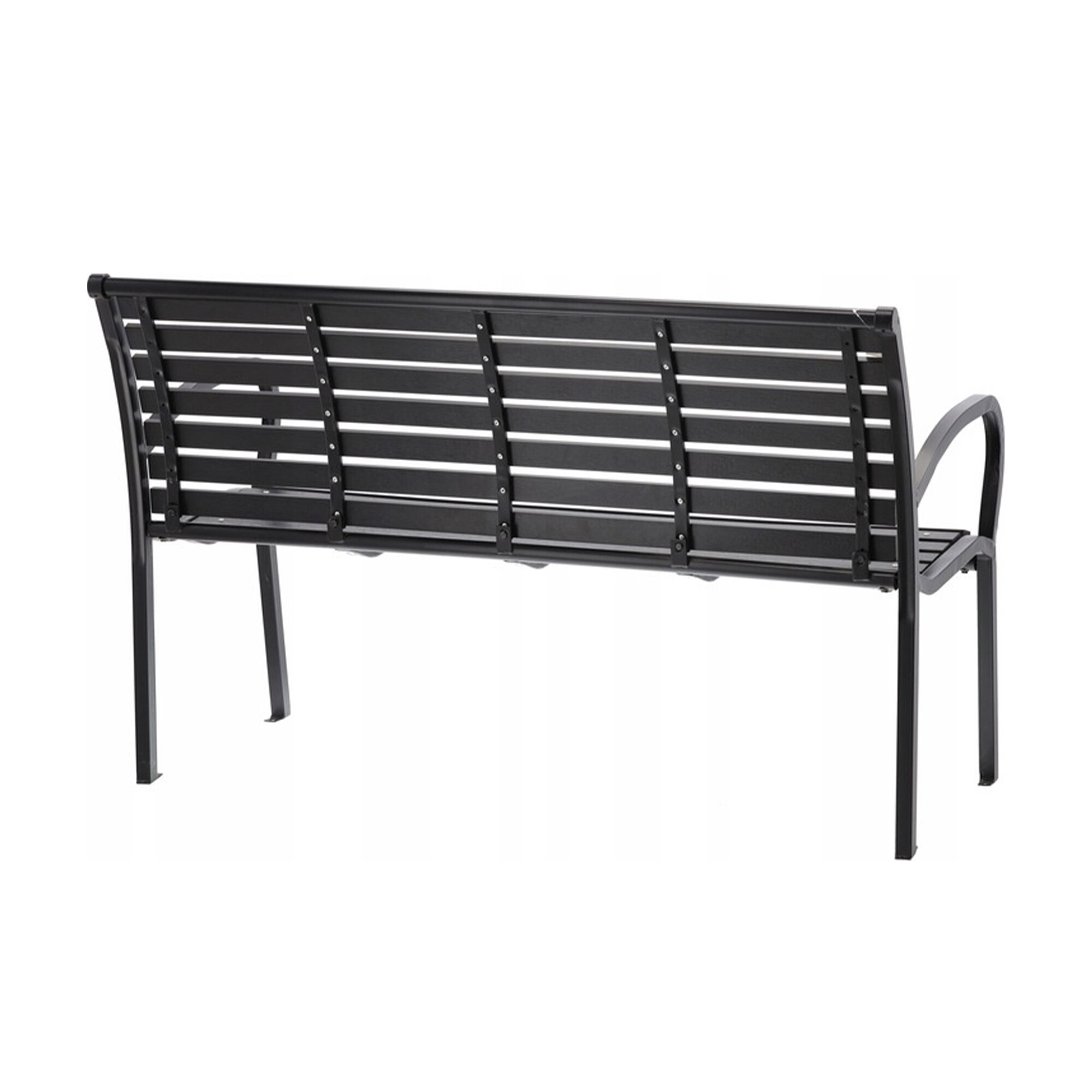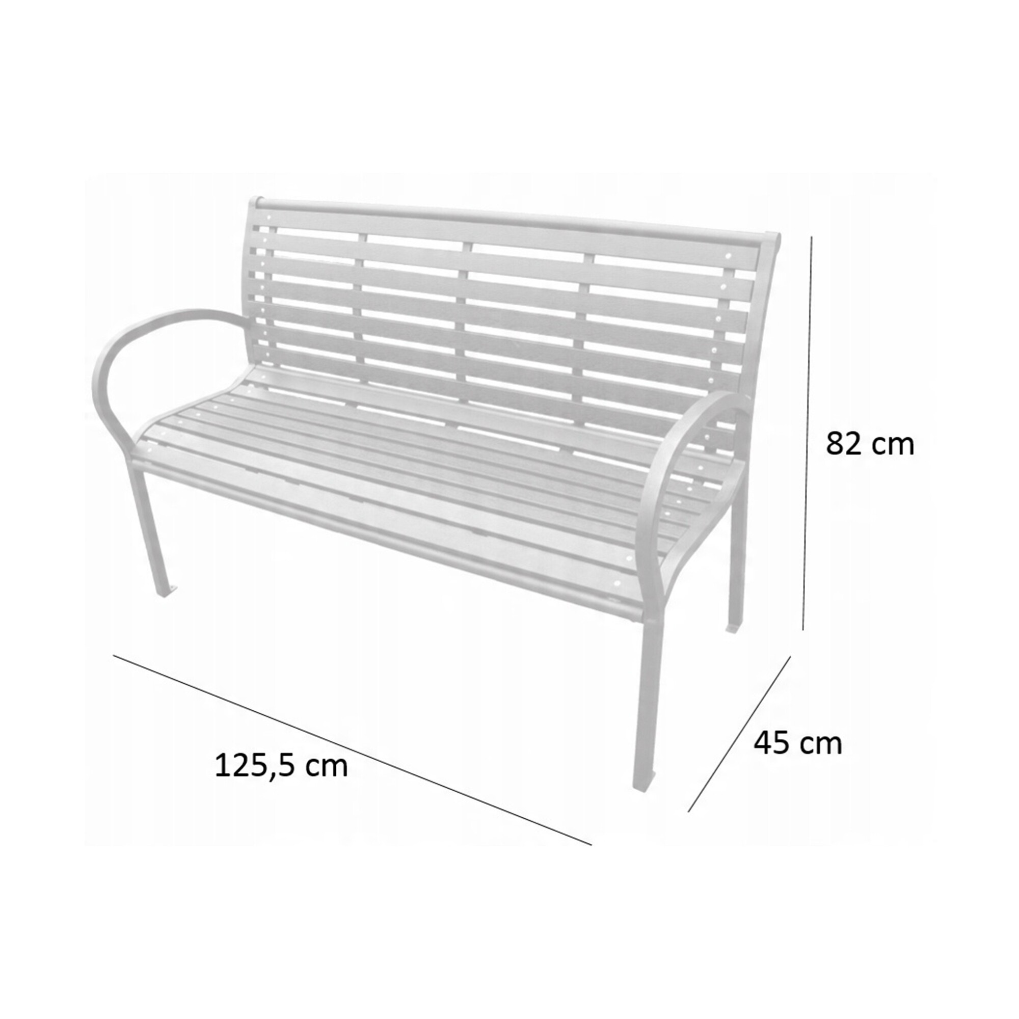 Feste Stahlkonstruktion, die mit Kunststofflatten ergänzt ist, die Holz imitieren. Tragfähigkeit der Bank 150 kg.