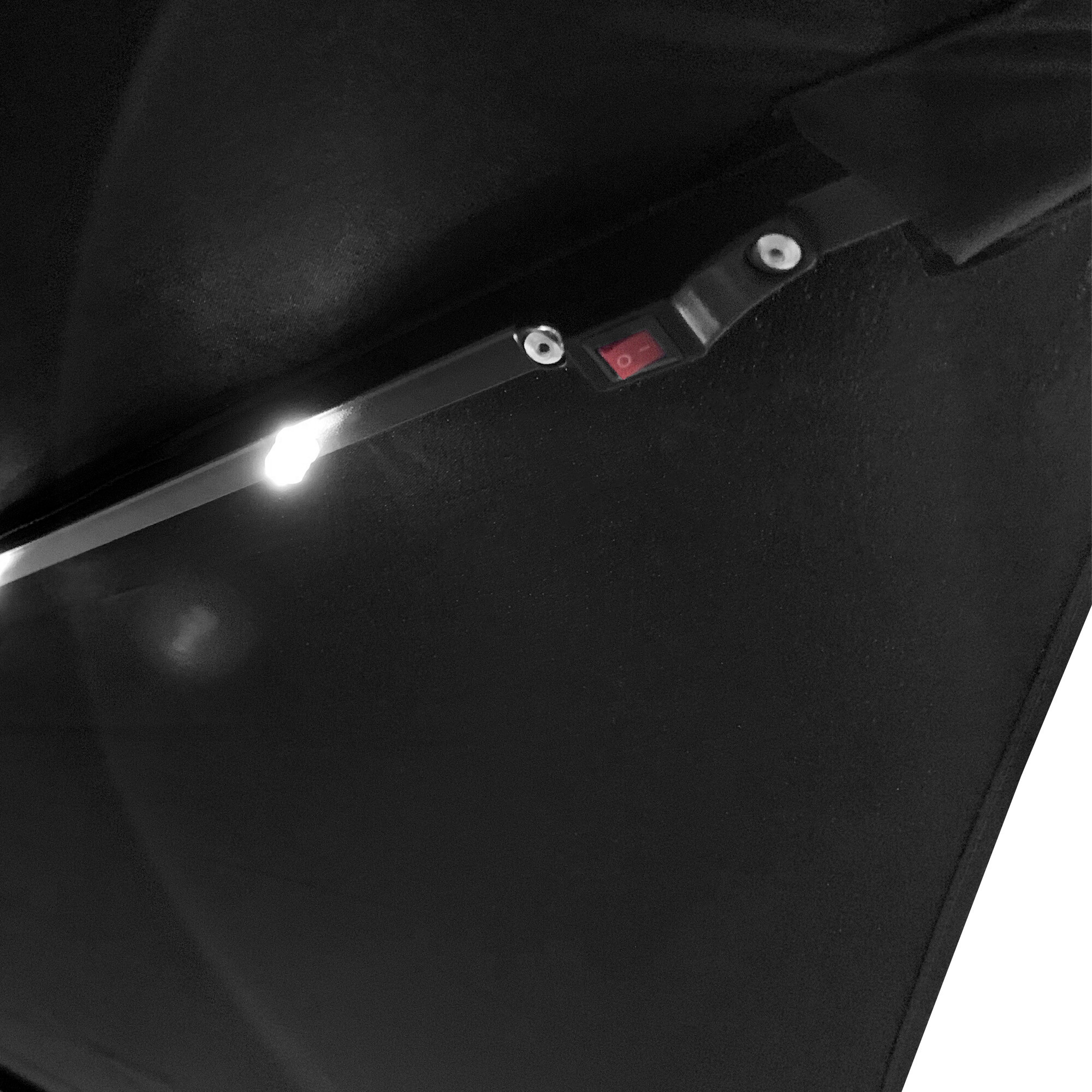 Dieses Material ist UV-beständig, langlebig und sehr leicht zu reinigen.Der Sonnenschirm hat 24 LED-Dioden entlang der Rippen, die von einem auf dem Schirm angebrachten Solarpanel gespeist werden.