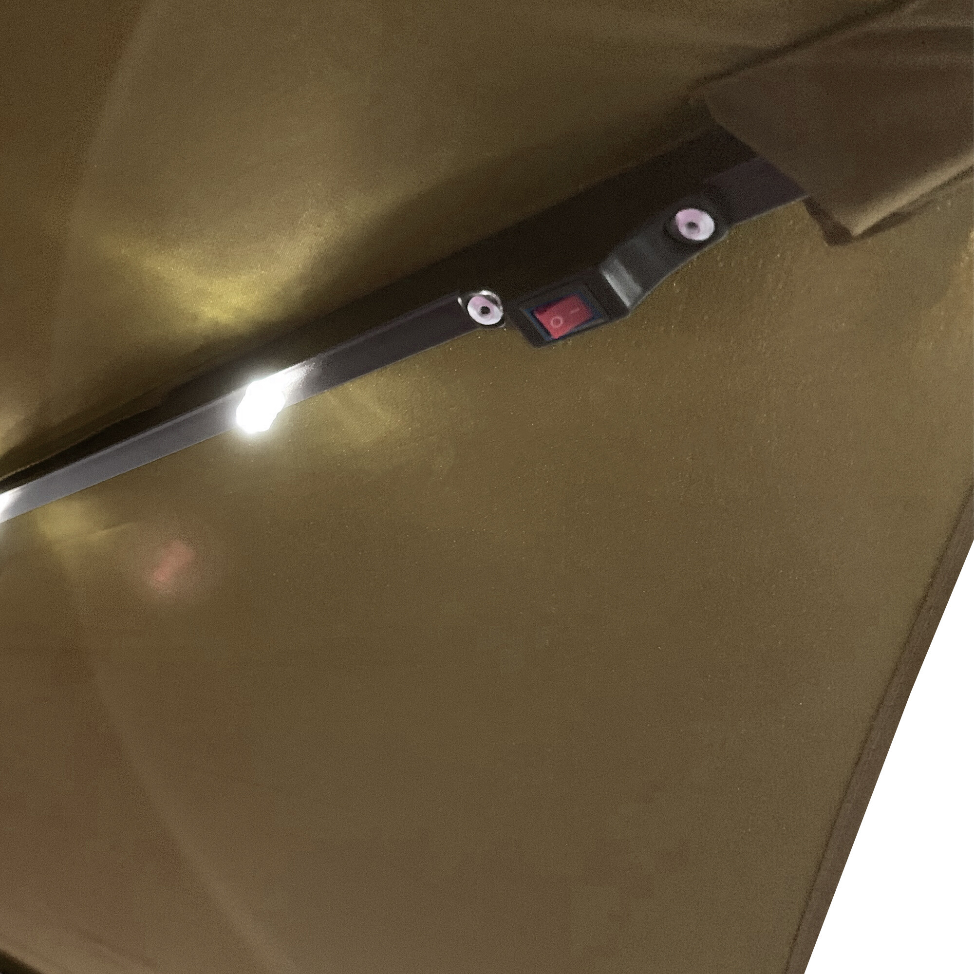 Dieses Material ist UV-beständig, langlebig und sehr leicht zu reinigen.Der Sonnenschirm hat 24 LED-Dioden entlang der Rippen, die von einem auf dem Schirm angebrachten Solarpanel gespeist werden.