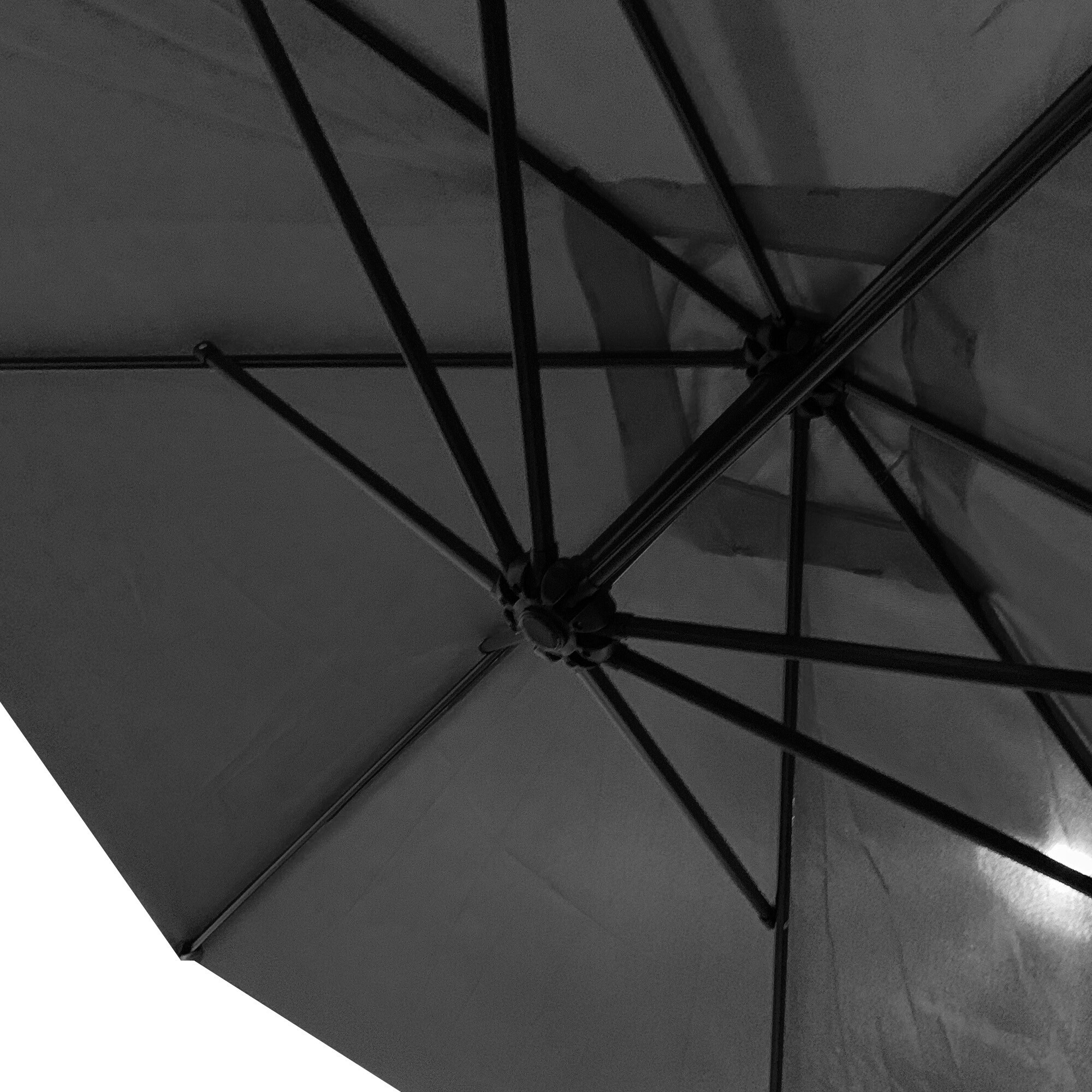 Gartenschirm aus strapazierfähigem Polyester, dessen Fuß sich außerhalb der beschatteten Fläche befindet.