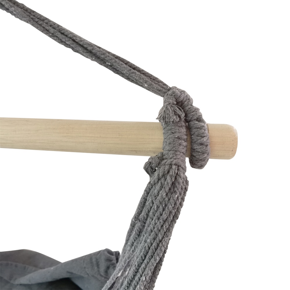 Der Schaukelstuhl ist mit einer hölzernen Querstange ausgestattet, die eine bequeme Haltung beim Ausruhen ermöglicht.