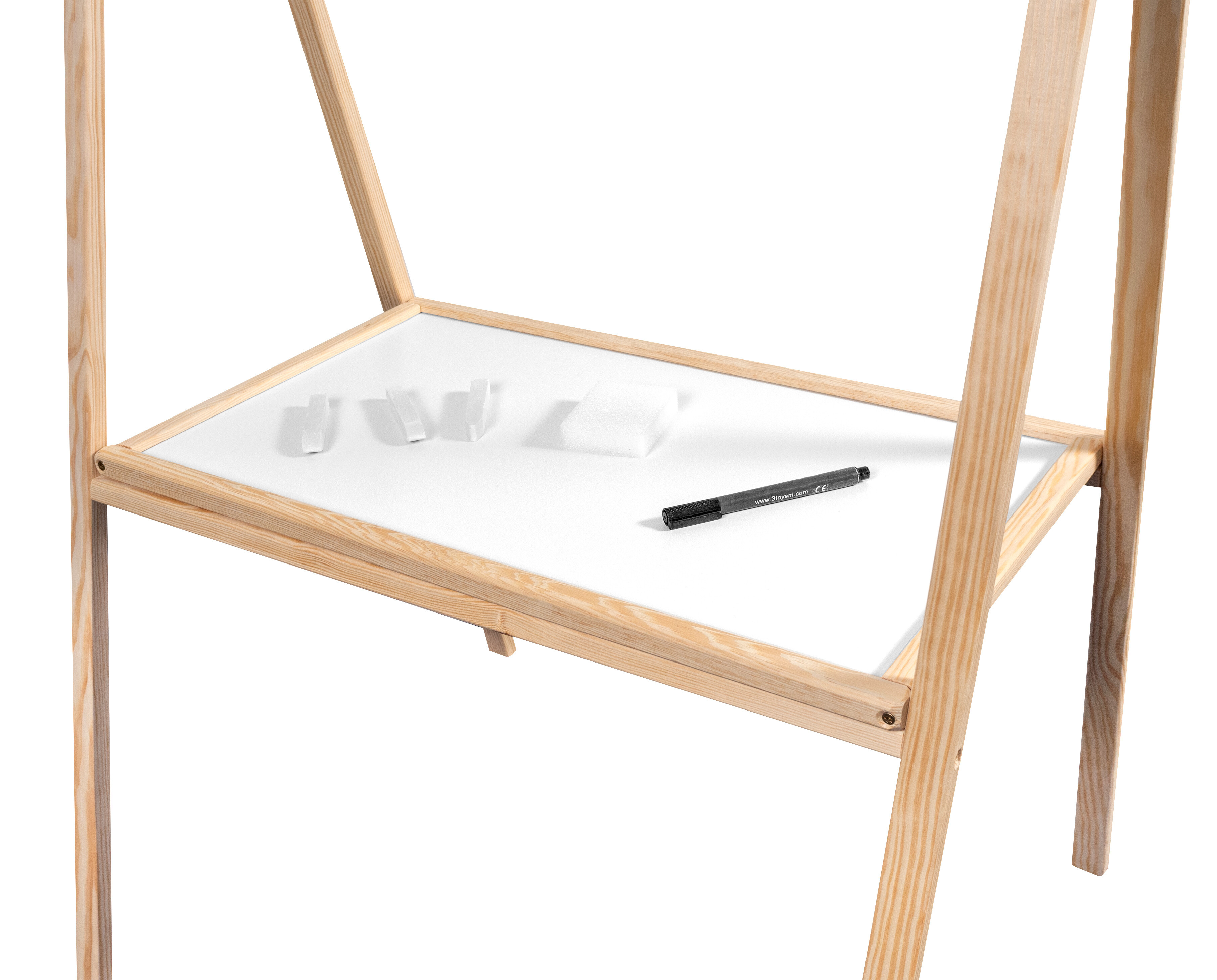 Auf der schwarzen Seite der Tafel können Kinder mit klassischen Kreiden malen und auf der anderen, weißen Seite mit bunten Filzstiften.