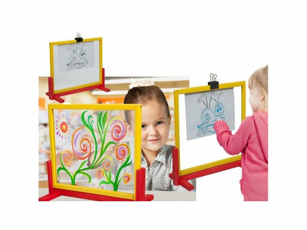 Kreative magnetische Kindertafel aus transparentem Sicherheitsglas (Plexiglas), auf die man mit Farben und Stiften verschiedene Muster und Zeichnungen malen kann.