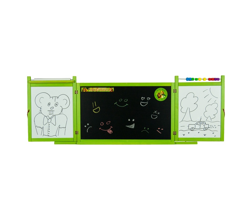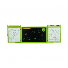 Auf die schwarze Tafel können Kinder mit klassischen Kreiden malen und auf die andere, weiße, dann mit bunten Filzstiften oder auf Papier mit Buntstiften.