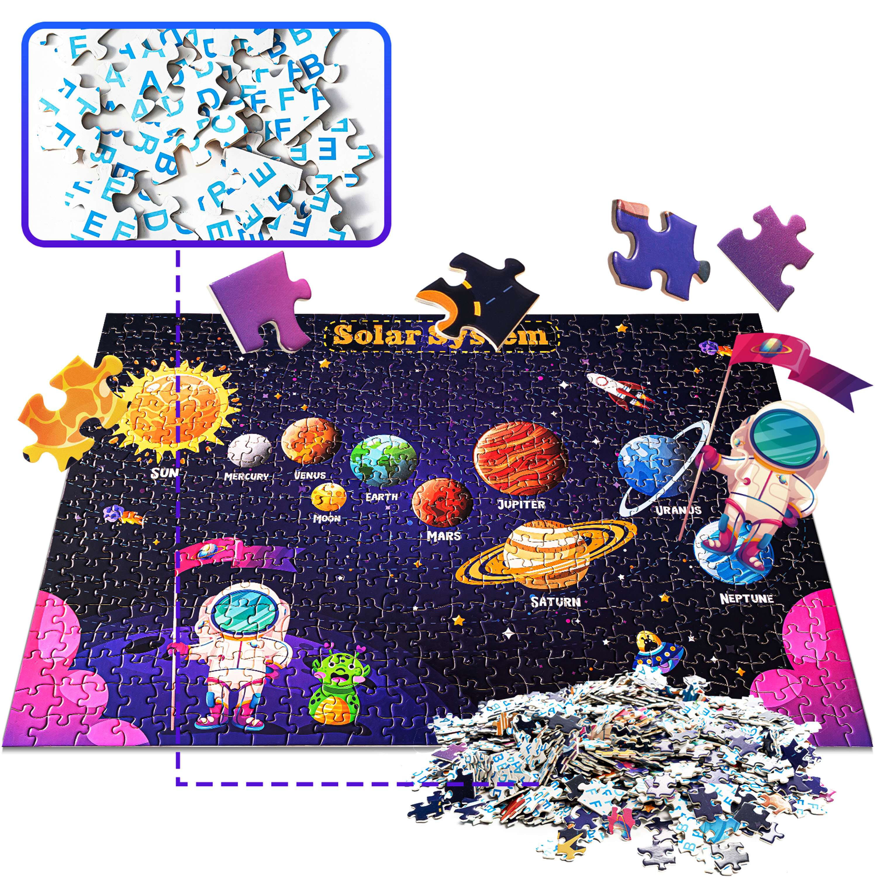 Außerdem haben die Puzzles Neon-Elemente, die Kinder begeistern werden. Wenn das Licht ausgeht, erwachen die Puzzles zum Leben und ihre Umrisse leuchten im Dunkeln wunderschön.
