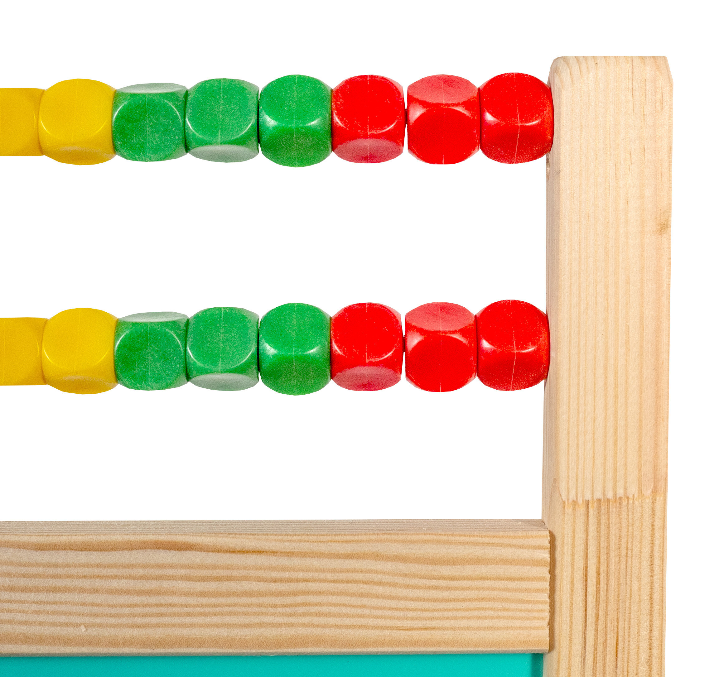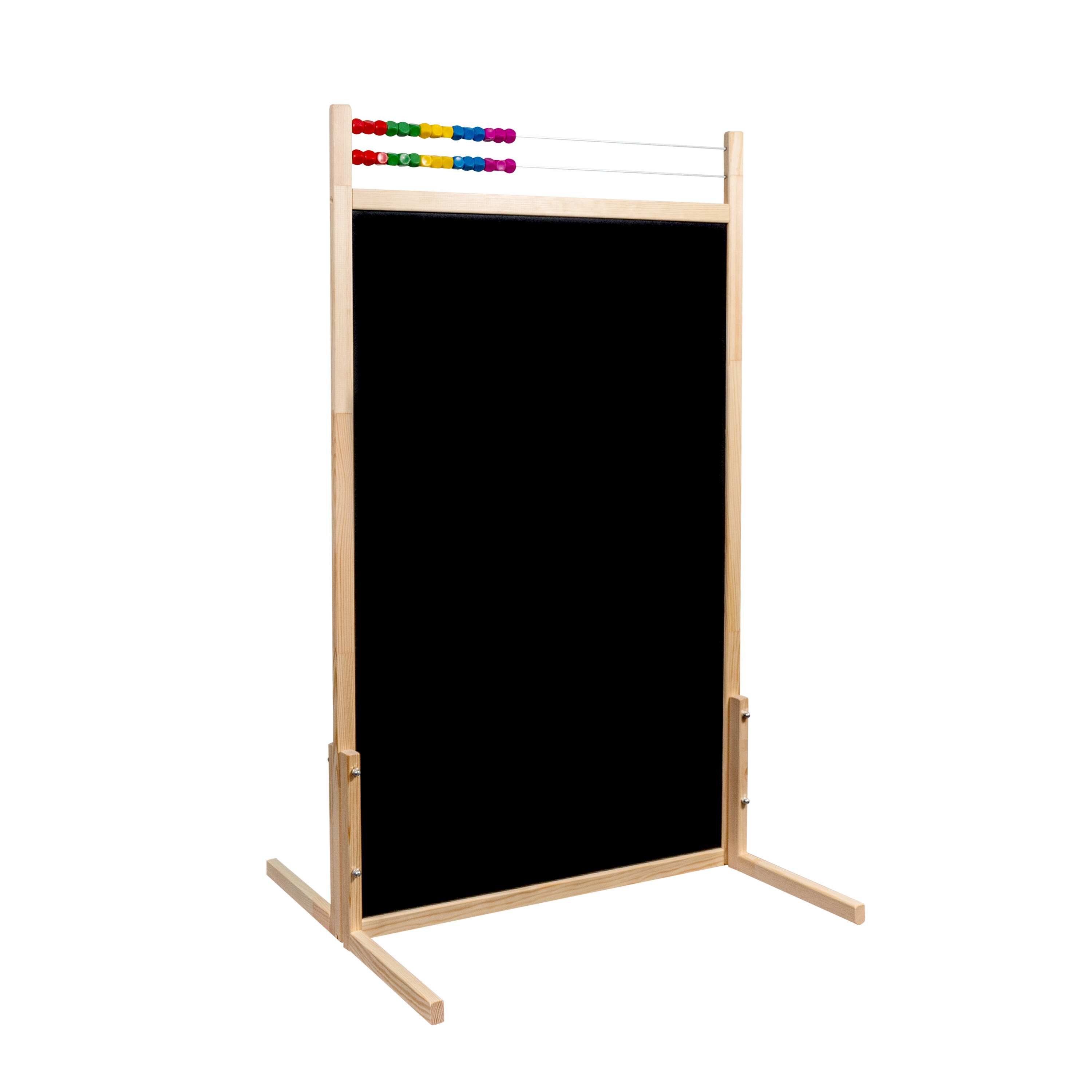Zeichnen ist auf beiden Seiten der Tafel möglich, auf der einen mit einem Stift und auf der anderen mit Kreide.Teil der Tafel ist auch ein zweireihiges Rechenbrett, das in jeder Reihe 15 bunte Kugeln enthält.