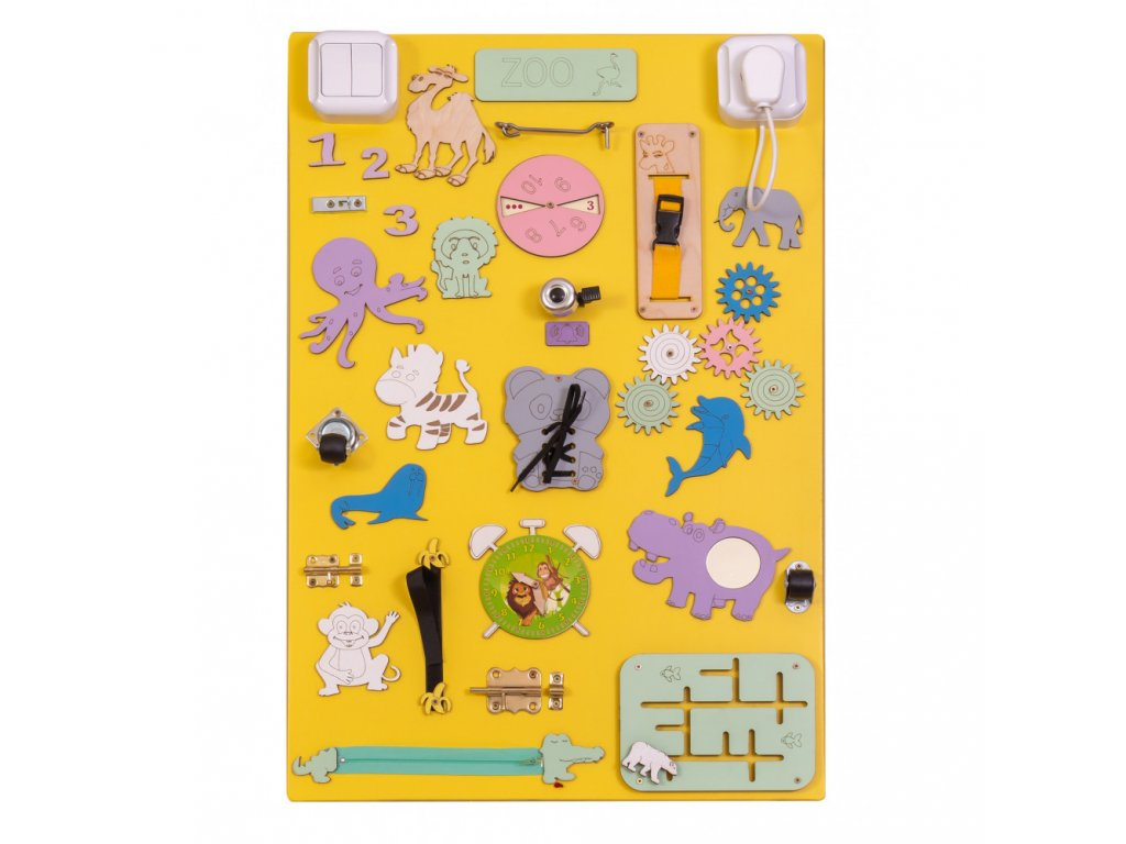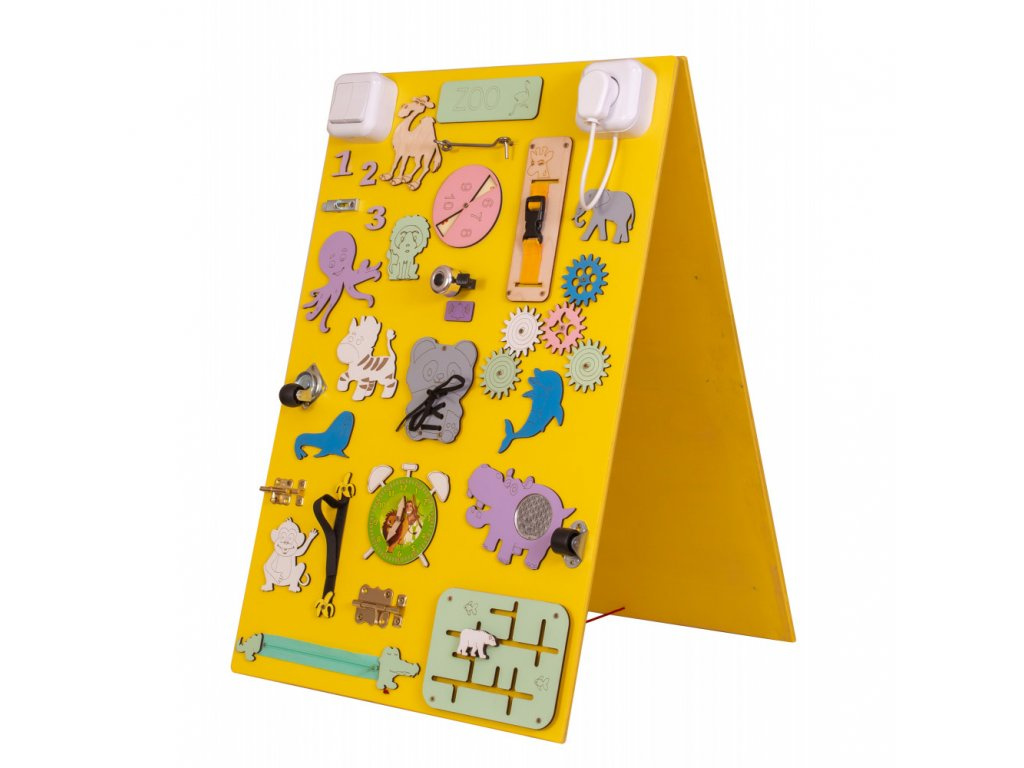 Kleine Kinderhände finden hier Anregungen, die das logische Denken fördern. Der bezaubernde Schuh ist eine einfache Möglichkeit, das Binden von Schnürsenkeln zu lernen, und der klassische Reißverschluss fördert die Kreativität.