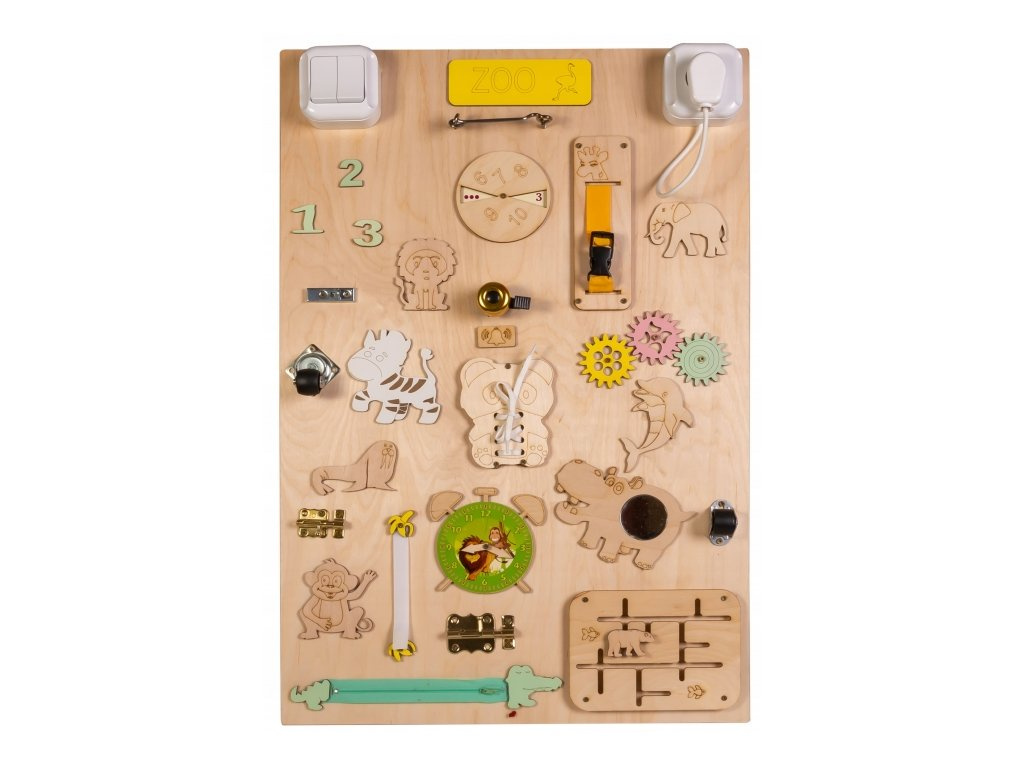 Kleine Kinderhände finden hier Anregungen, die das logische Denken fördern. Der bezaubernde Schuh ist eine einfache Möglichkeit, das Binden von Schnürsenkeln zu lernen, und der klassische Reißverschluss fördert die Kreativität.