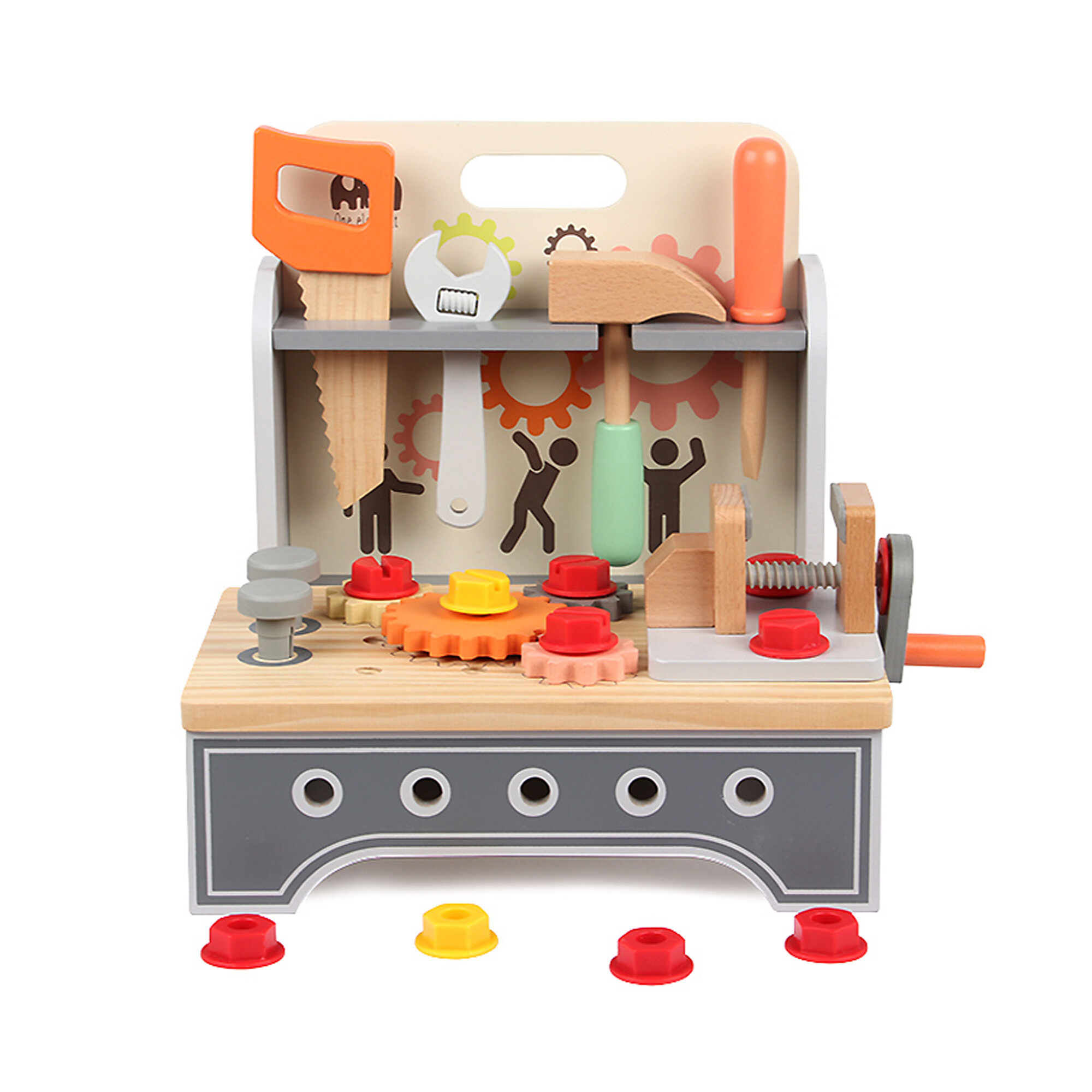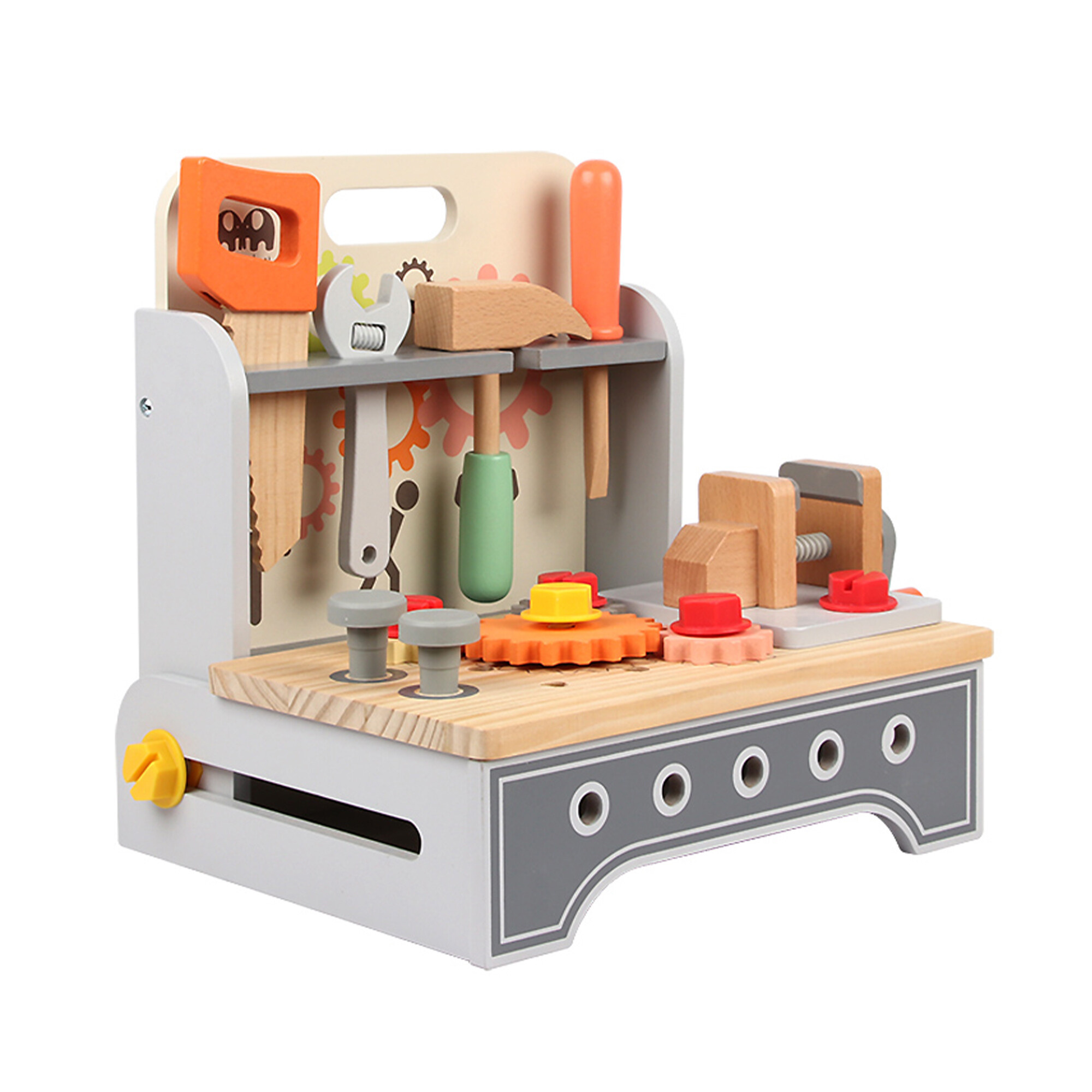 Die Werkstatt enthält alles, was ein kleiner Handwerker braucht - Säge, Schraubendreher, Schrauben, verstellbaren Schlüssel, Bohrmaschine, Schraubstock und weiteres Zubehör.