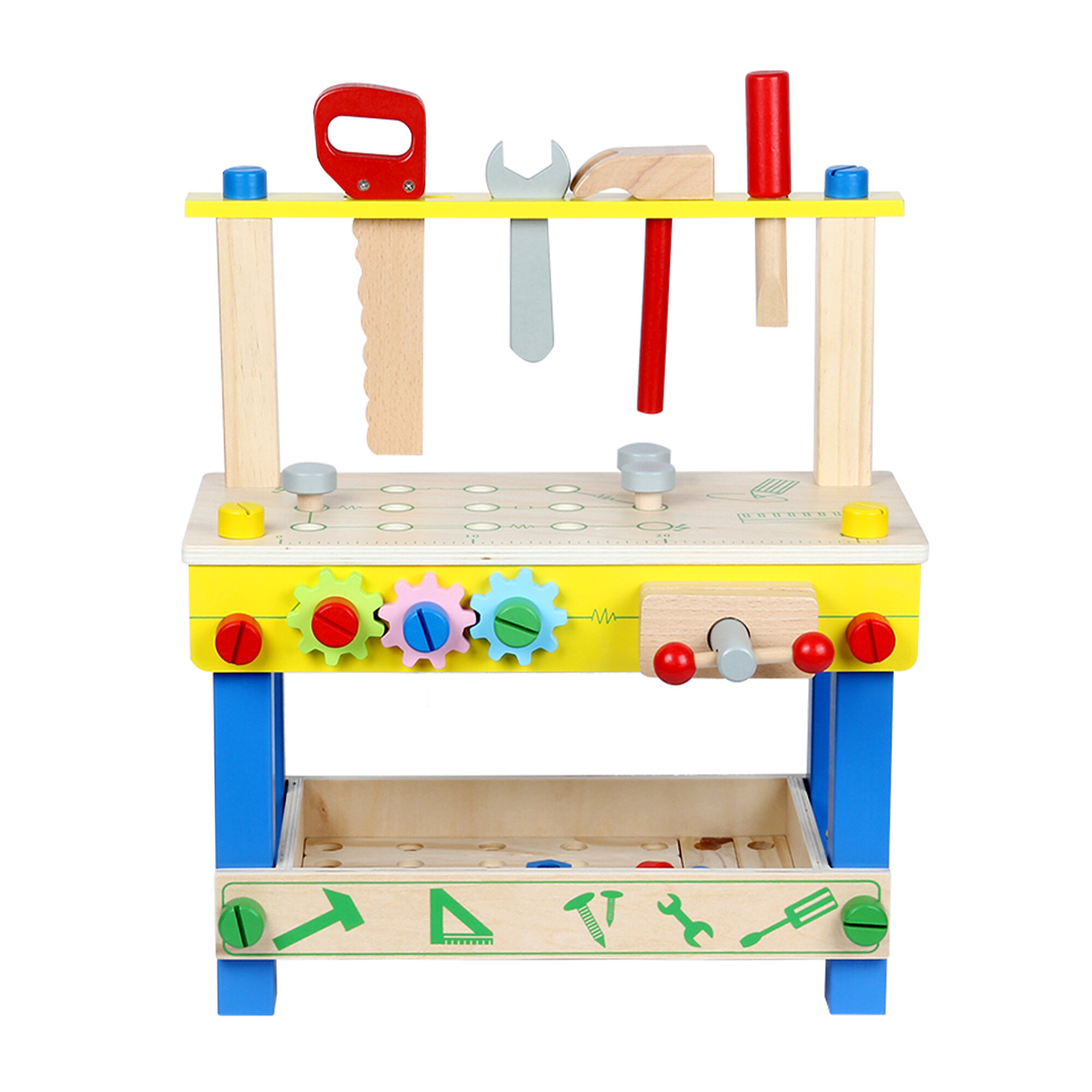 Die Werkbank enthält alles, was ein kleiner Handwerker braucht - Hammer, Schraubendreher, Säge, Schrauben, Schlüssel, Muttern, Schraubstock und weiteres Zubehör.