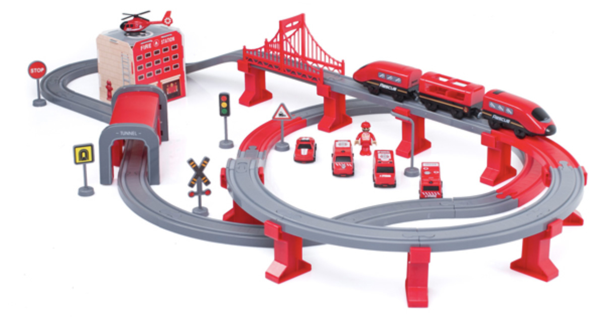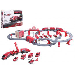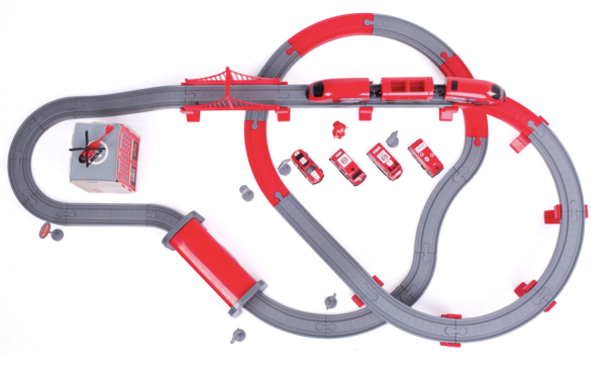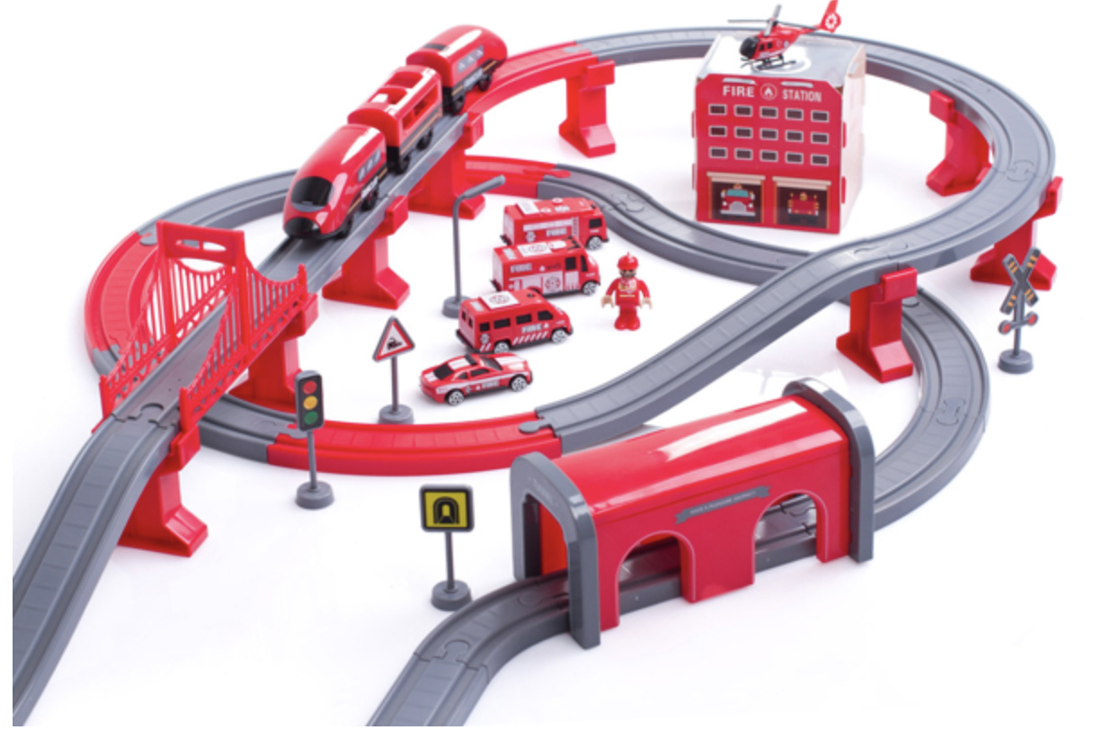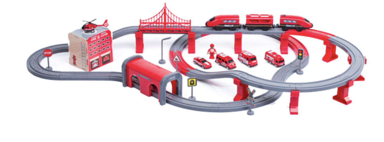 Die 2in1-Zugstrecke ist eine Kombination aus einer Zugstrecke und einer Feuerwache.Eisenbahnstrecke mit reichhaltigem Zubehör von Aga4Kids.