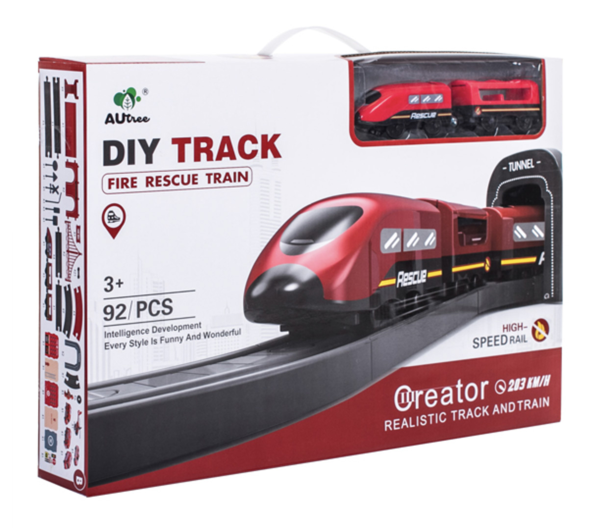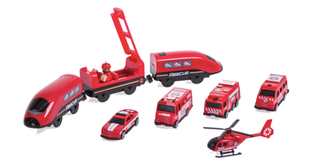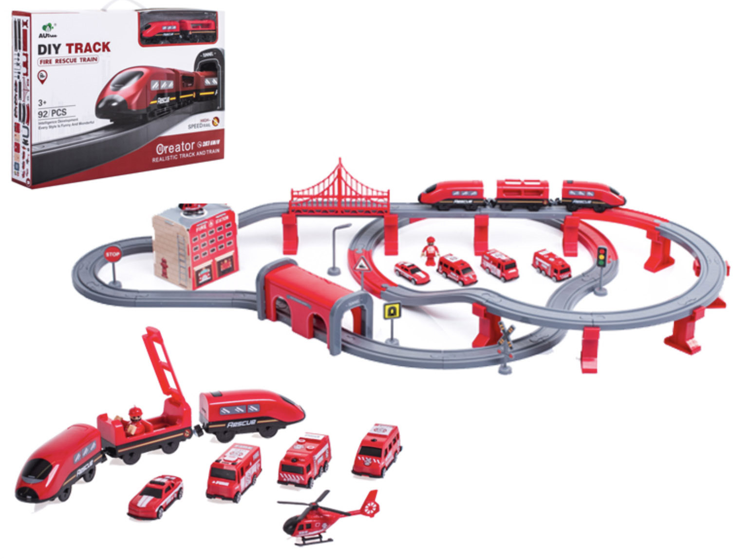 Die 2in1-Zugstrecke ist eine Kombination aus einer Zugstrecke und einer Feuerwache.Eisenbahnstrecke mit reichhaltigem Zubehör von Aga4Kids.