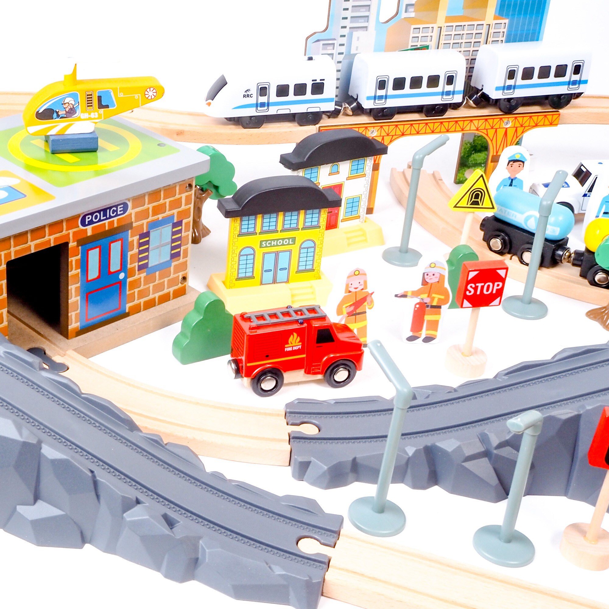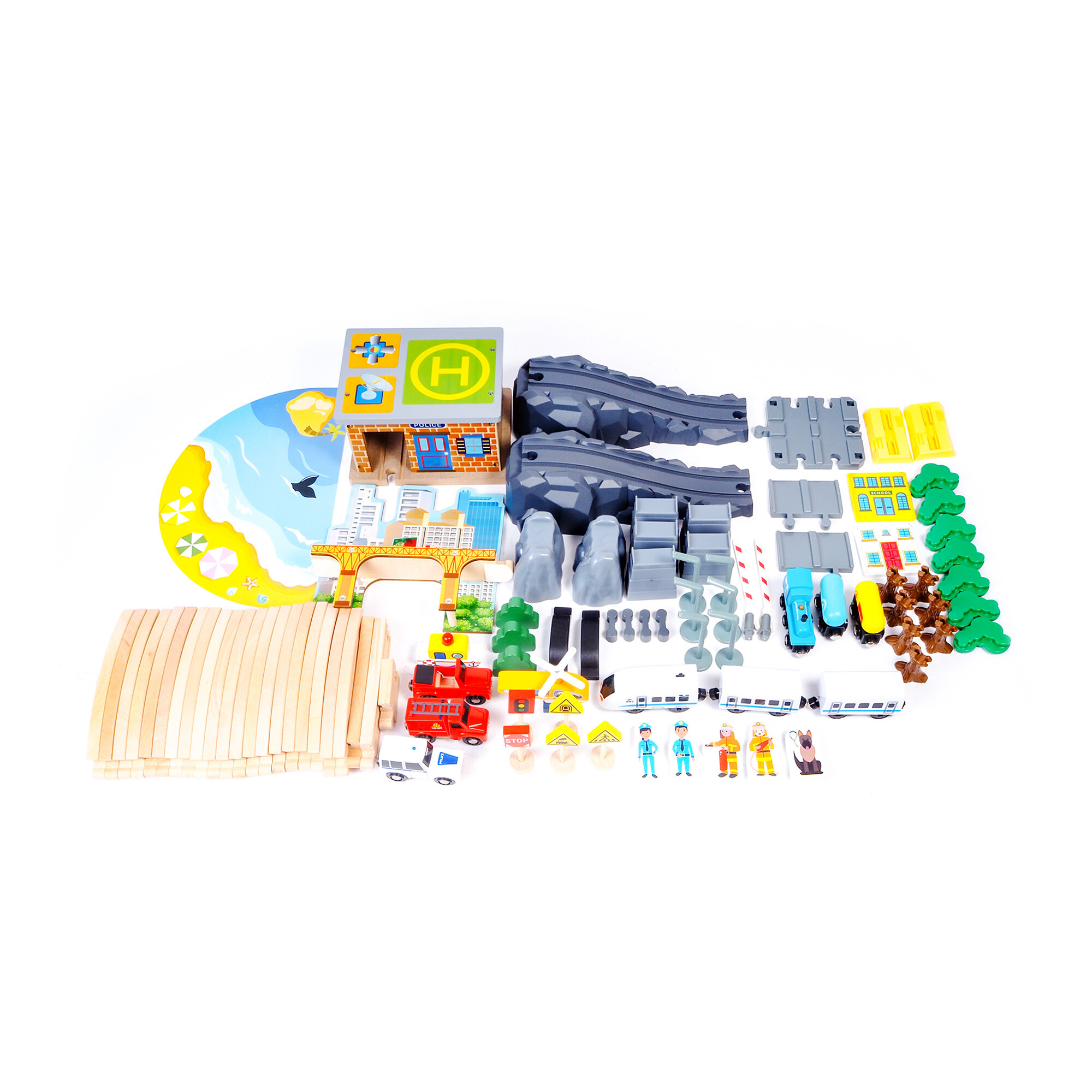 - Das Set enthält - Schienenteile mit Brücke, Züge, Lokomotive, Waggons, Haltestelle, Autos, Gebäude, Figuren, Verkehrsschilder, Hubschrauber und Bäume