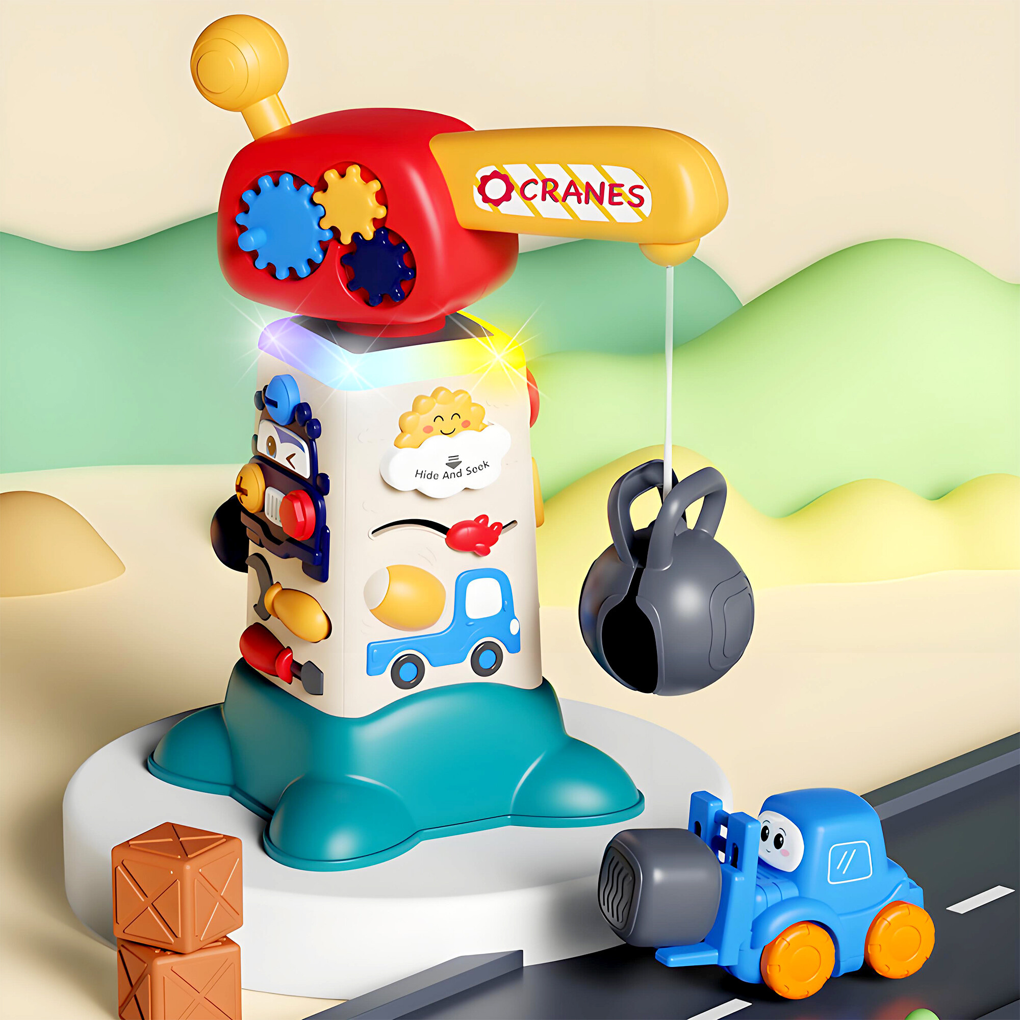 Der interaktive Kran ist mit vielen Funktionen ausgestattet, die die Entwicklung von Kindern unterstützen. Jede Seite des Krans bietet einzigartige Aktivitäten, die verschiedene Sinne und Fähigkeiten stimulieren.