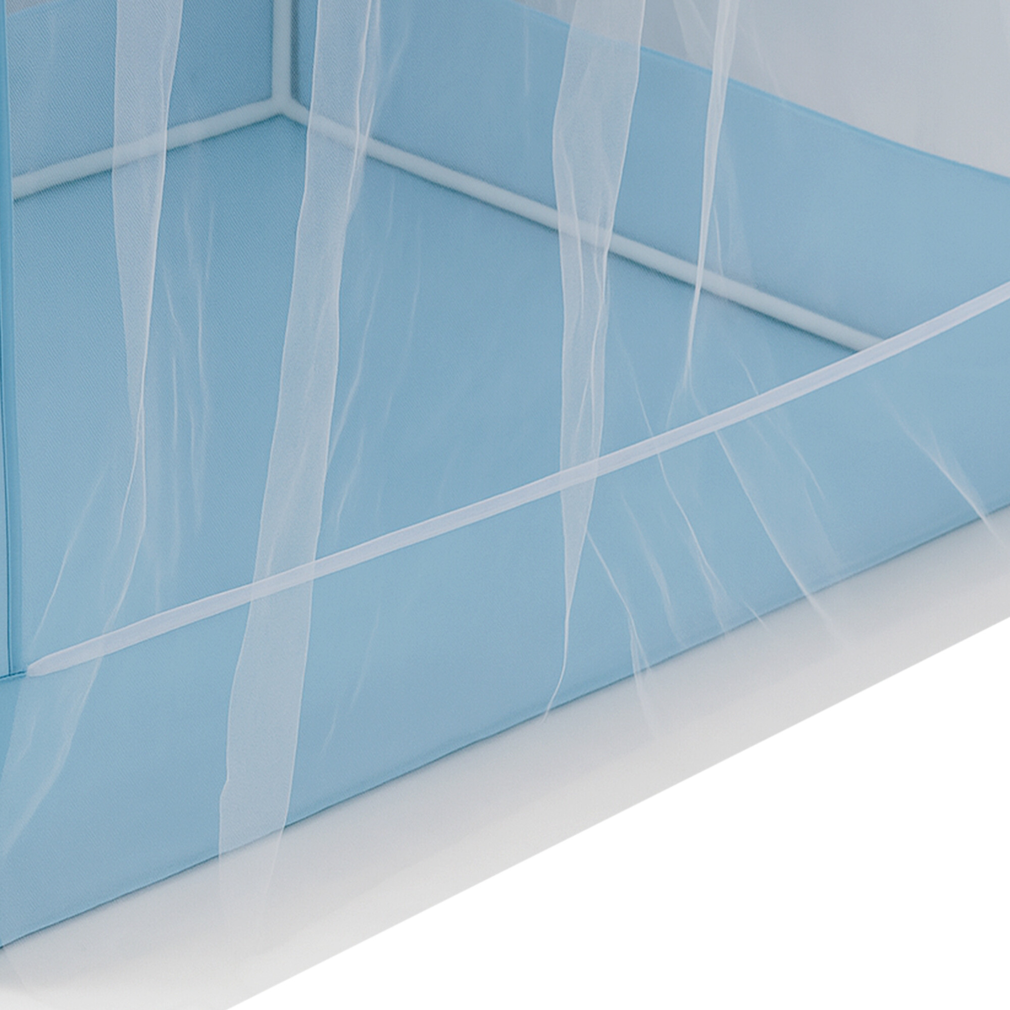 Das Zelt hat einen leichten, aber stabilen Rahmen und ist mit einem feinen Polyesterstoff überzogen. Transparente Netz-Wände lassen genügend Licht und Luft durch, sodass es innen immer angenehm ist. Die Eingangsöffnung kann einfach zurückgeschoben werden, um so einen offenen Raum zum Spielen zu schaffen.