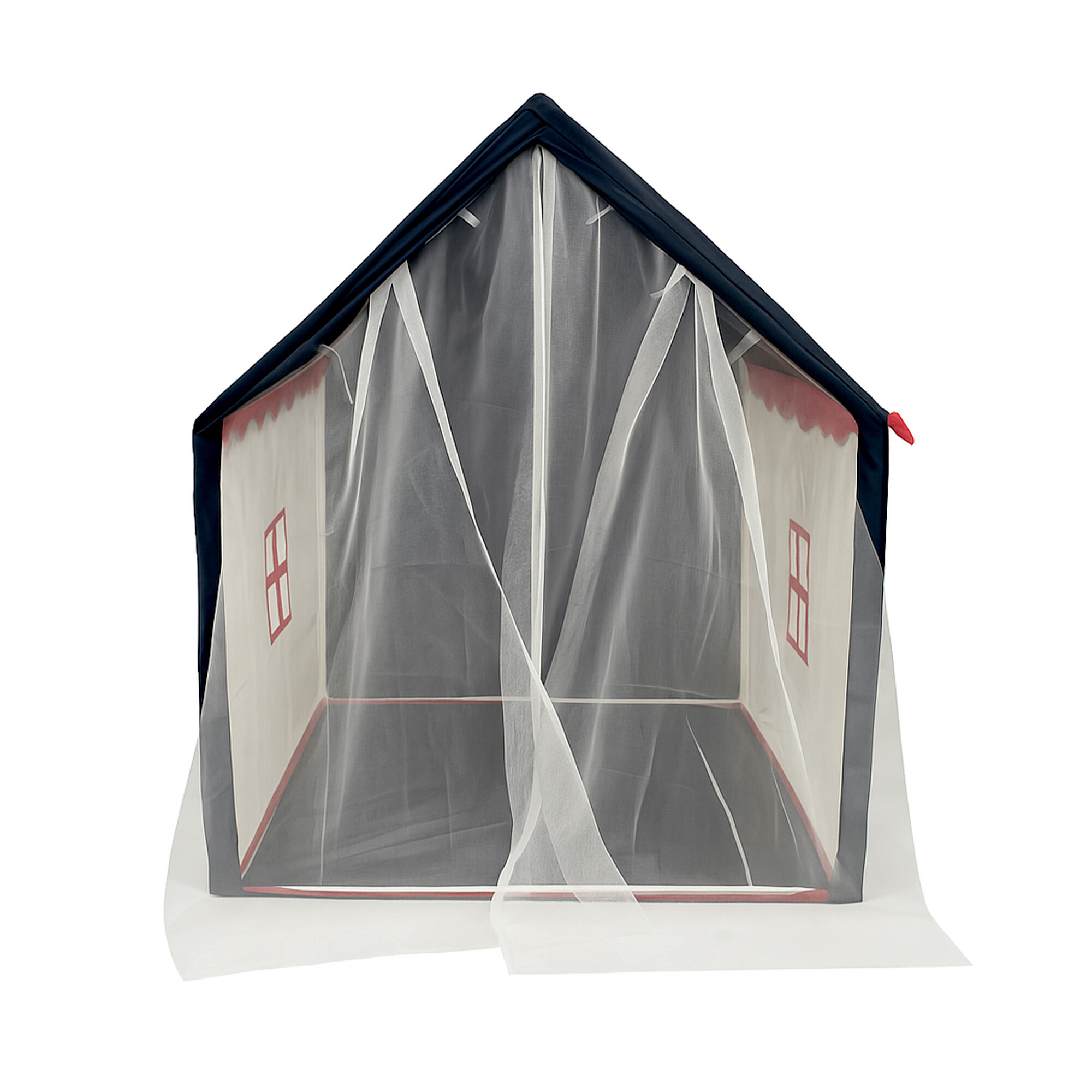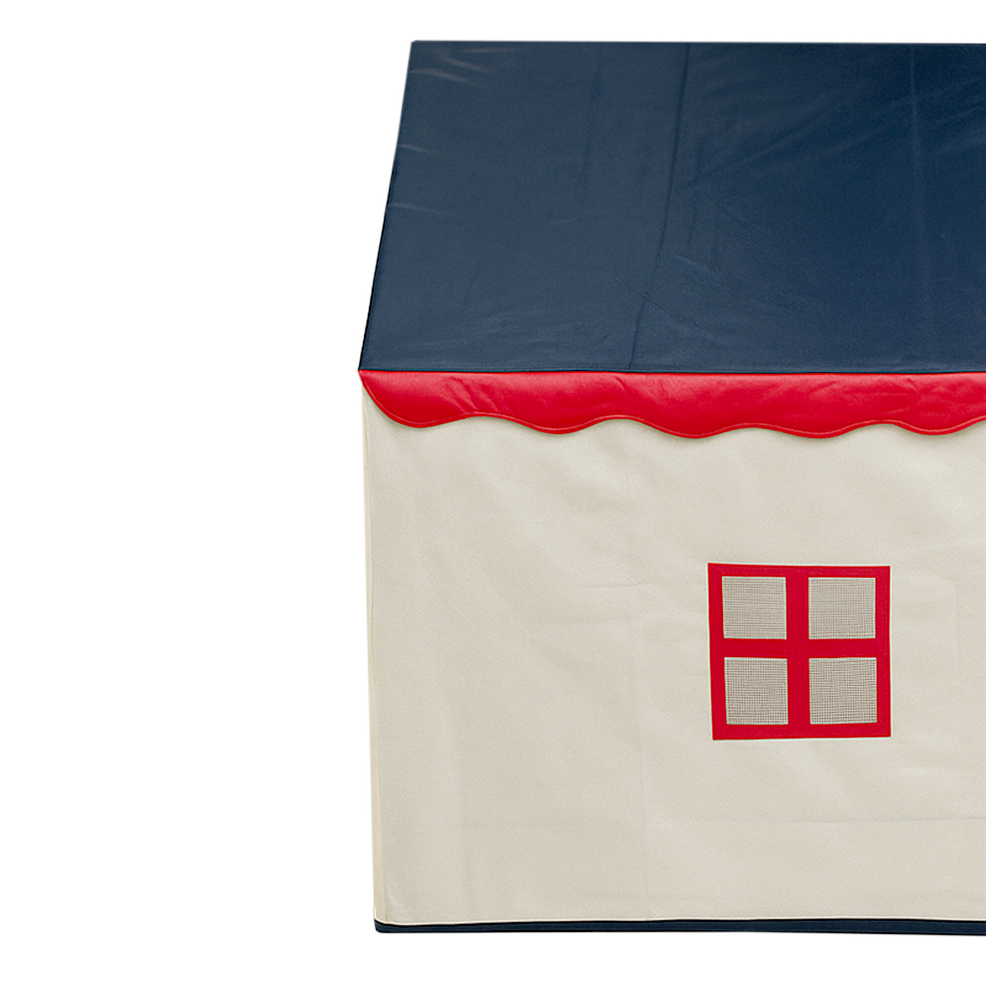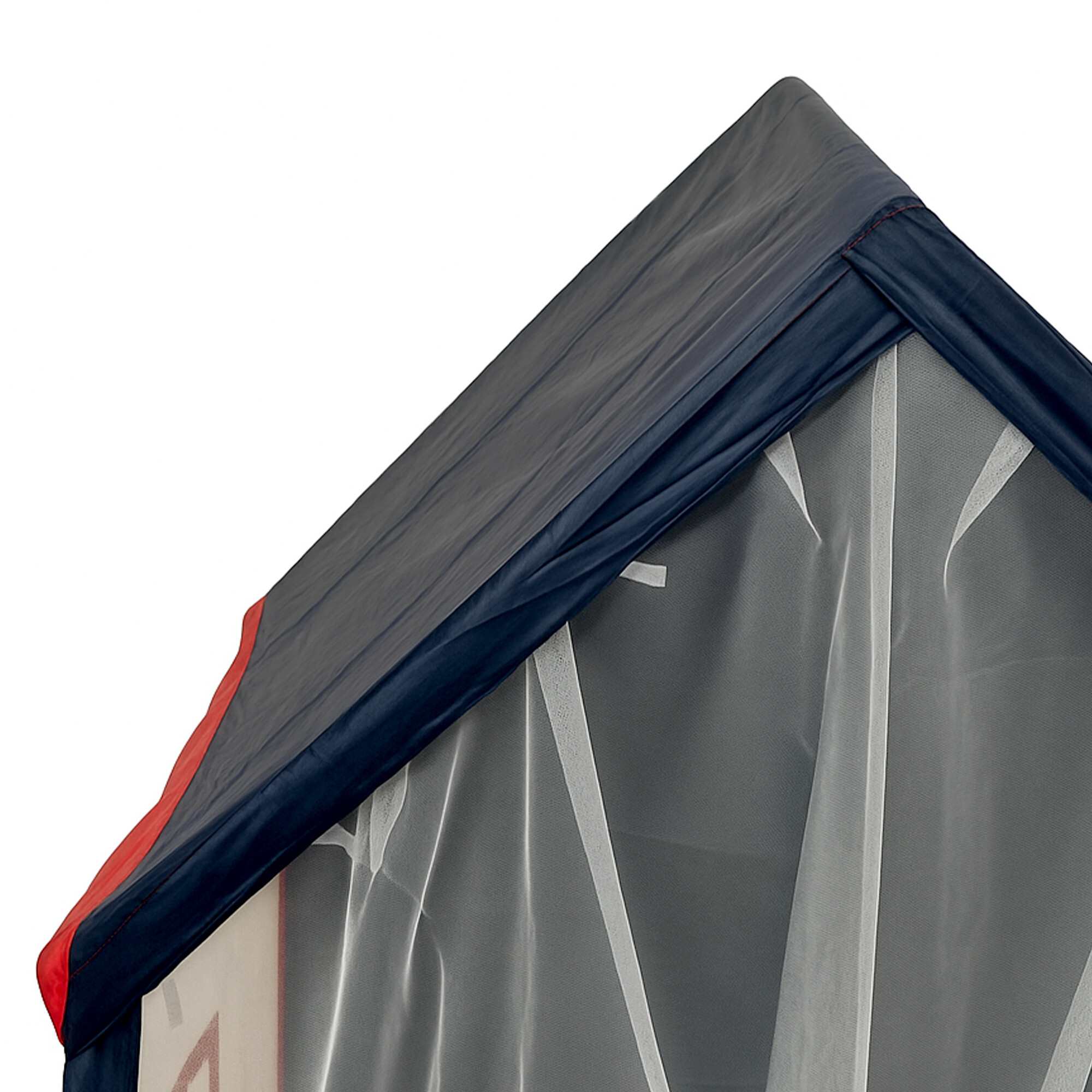 Das Zelt hat eine stabile Konstruktion und ist mit einem festen Stoff in einer eleganten Kombination aus dunkelblau, rot und beige überzogen. An den Seiten finden Sie Fenster für ausreichend Licht und Luft sowie eine Eingangstür mit einem leichten Netz, das sich leicht zurückziehen lässt.
