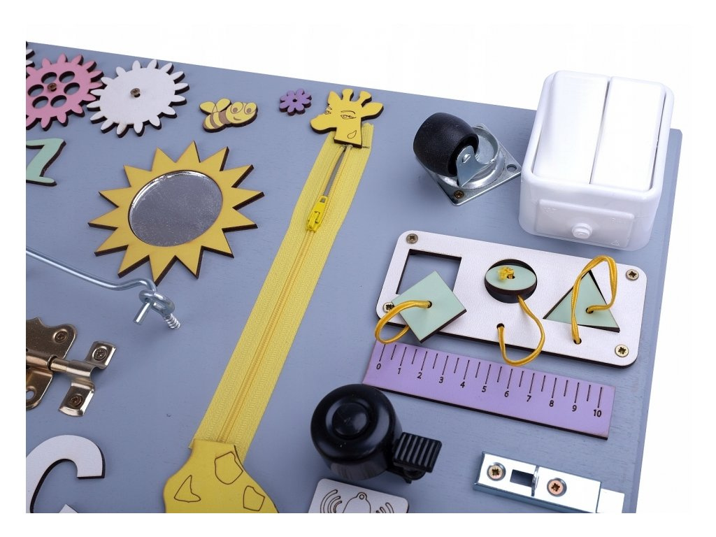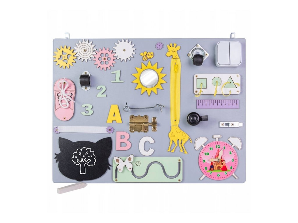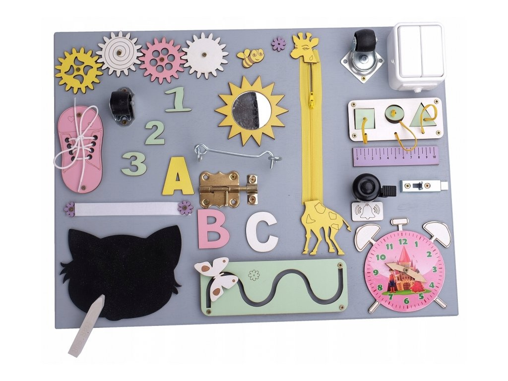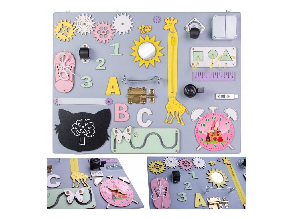 Kleine Kinderhände finden hier Anregungen, die das logische Denken fördern. Der bezaubernde Schuh ist eine einfache Möglichkeit, das Binden von Schnürsenkeln zu lernen, und der klassische Reißverschluss fördert die Kreativität.