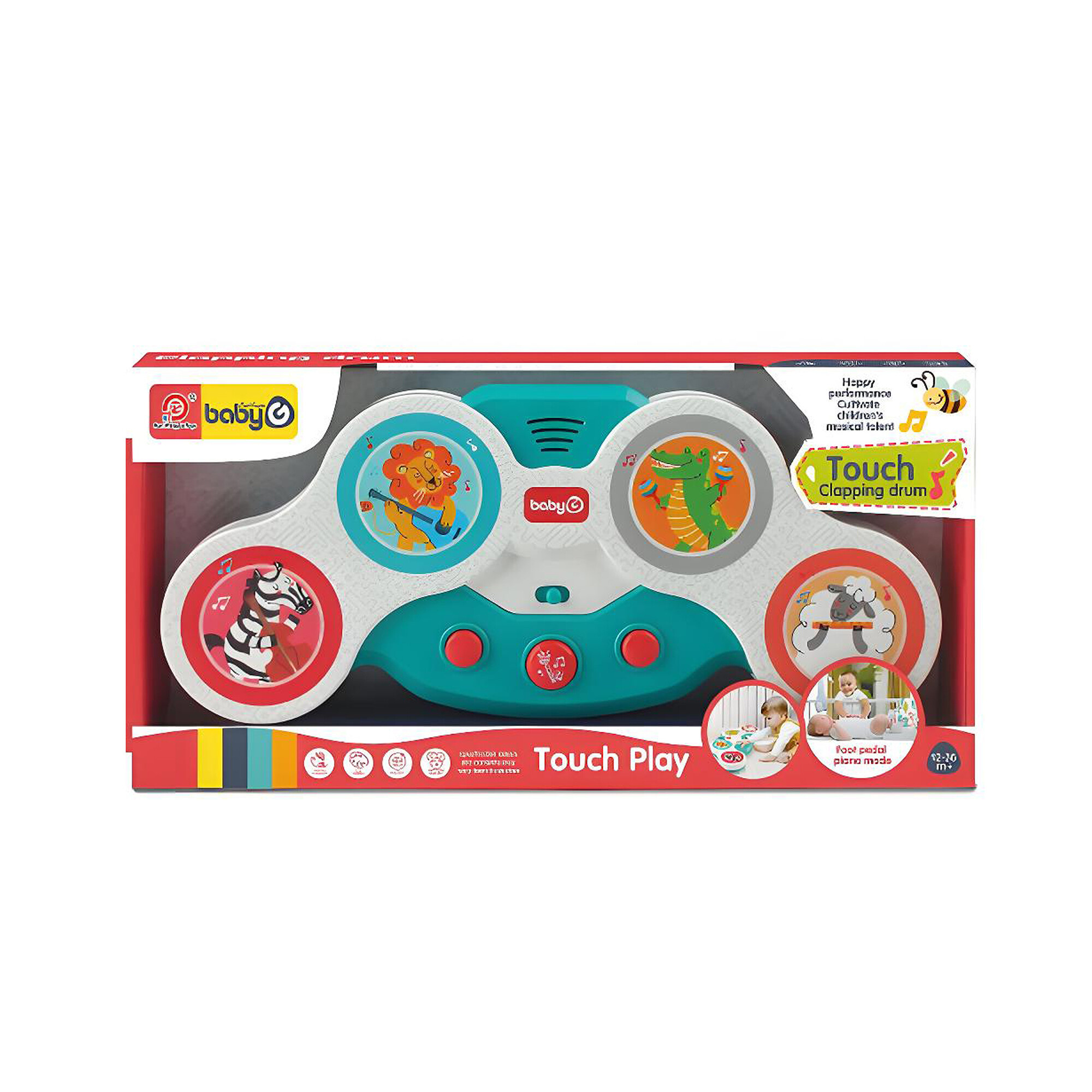 Die taktilen Flächen umfassen Illustrationen entzückender Tiere wie Zebra, Löwe, Tiger und Elefant, die die Aufmerksamkeit auf sich ziehen und die visuelle Stimulation fördern.Die Oberfläche der Trommel reagiert auf eine leichte Berührung und aktiviert fesselnde Klänge und Melodien, die Ihr Kind faszinieren und unterhalten.