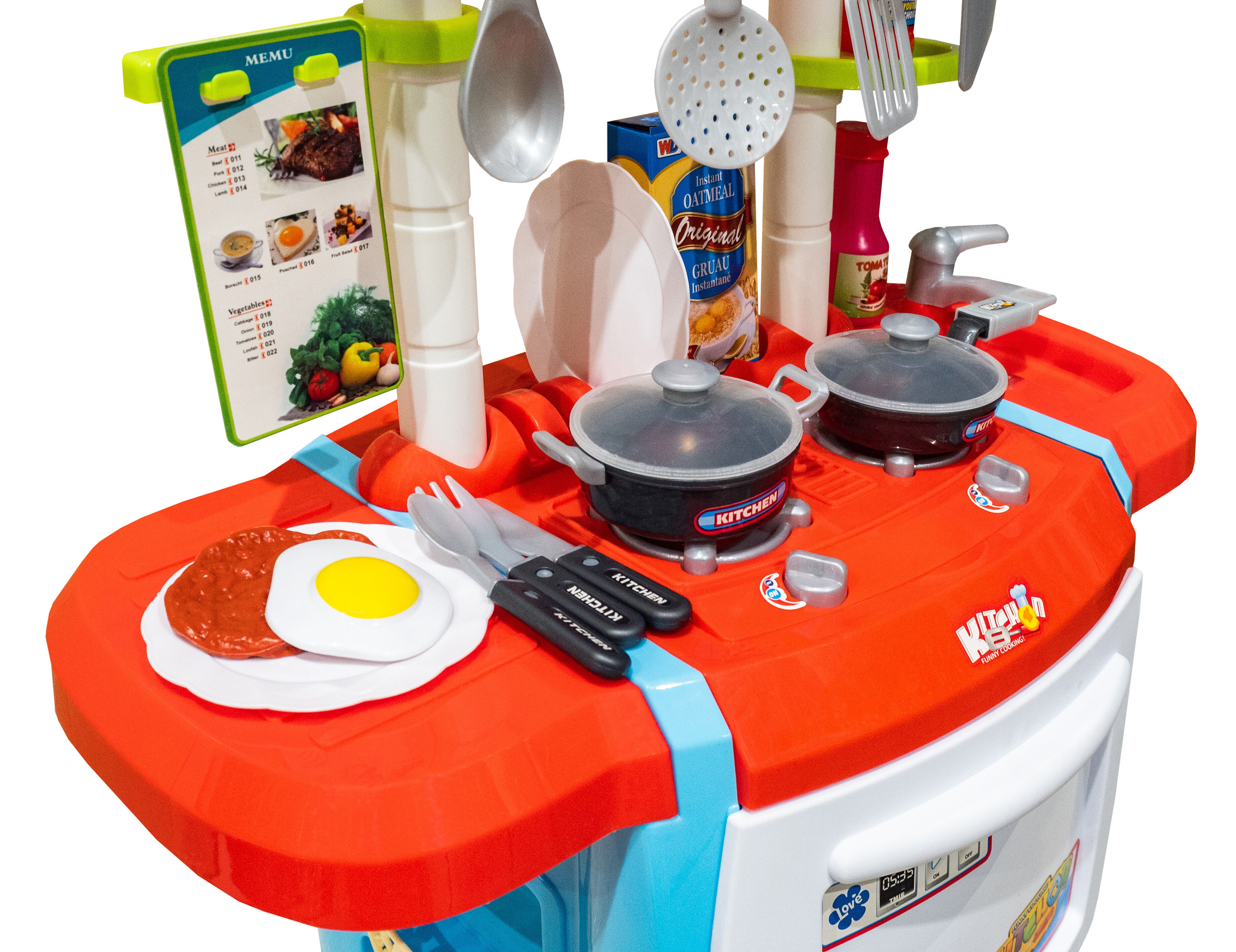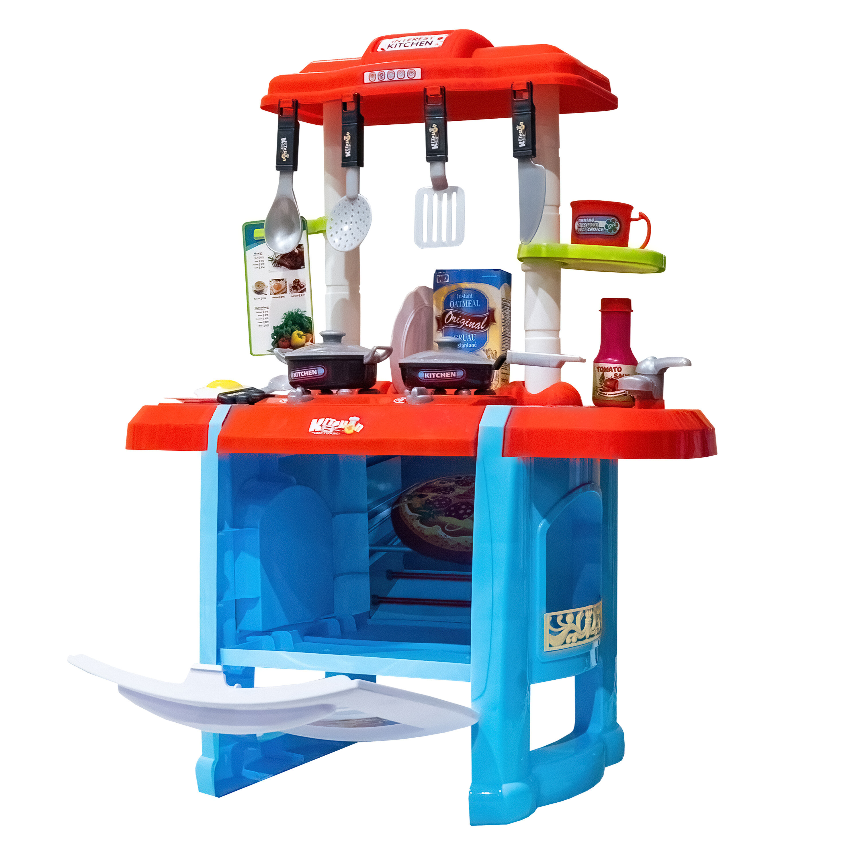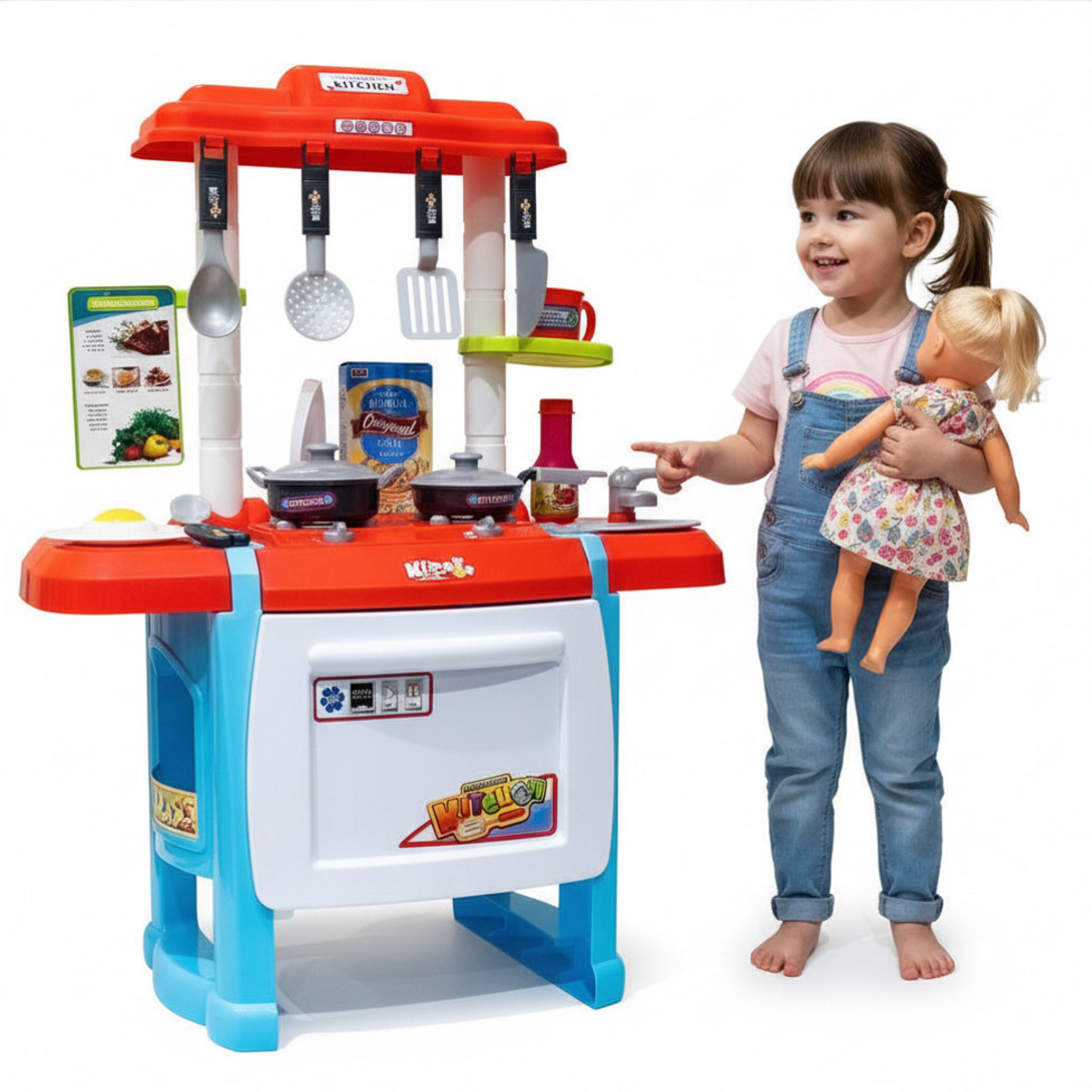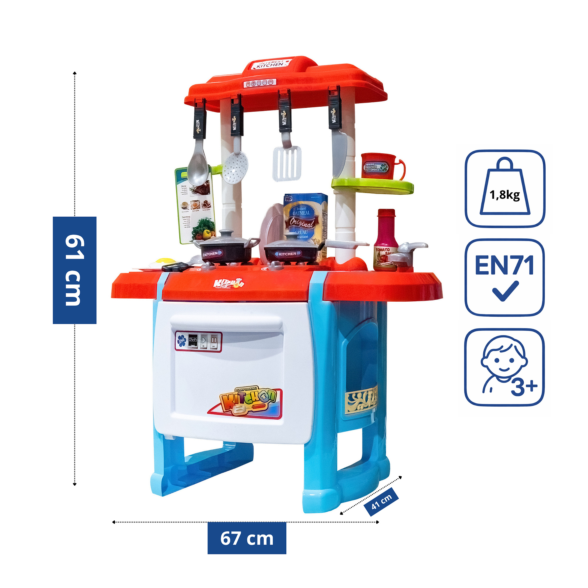 Aga4Kids Plastik-Kinderküche mit Zweiplattenherd und Backofen, Küchenspülbecken mit Wasserhahn, beleuchtete Brenner und Dunstabzugshaube, Rot/Blau