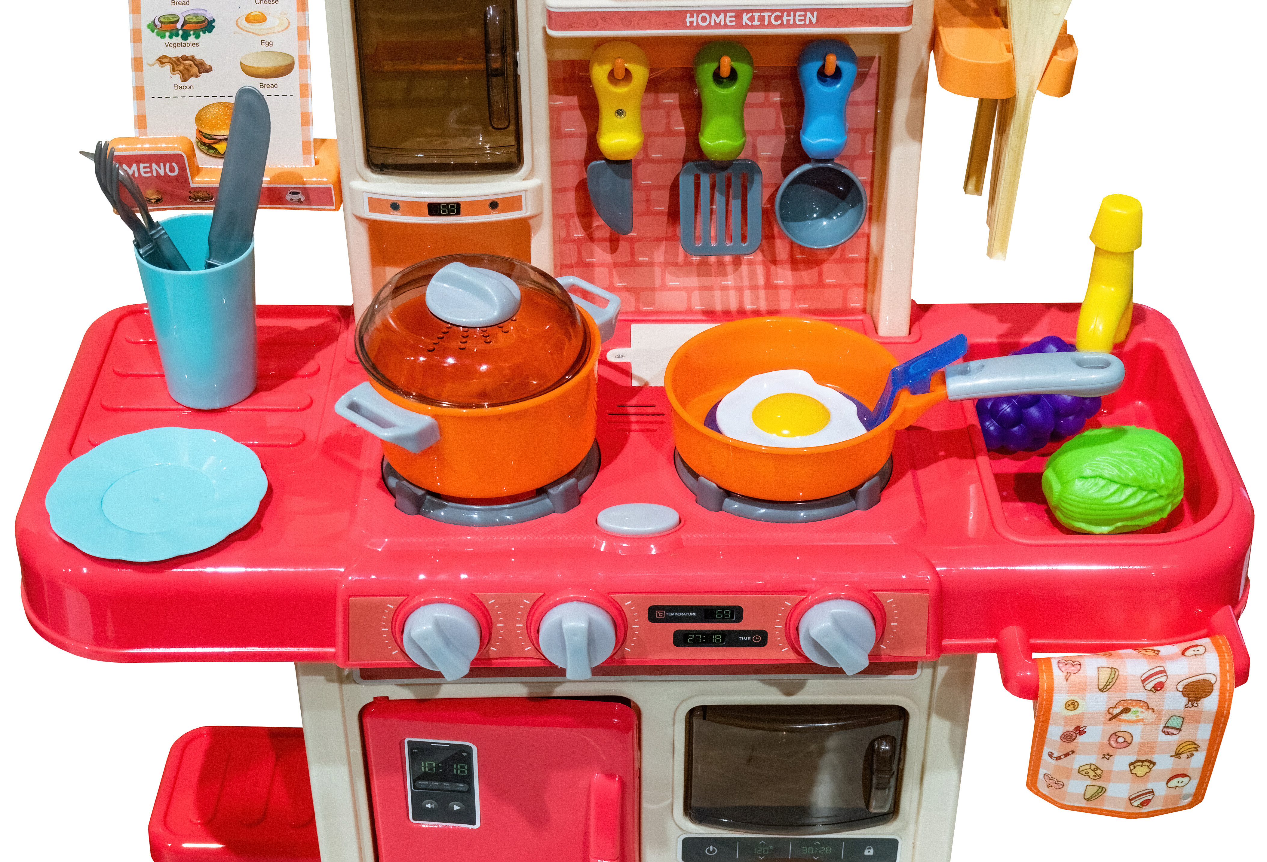 - Enthält viele verschiedene Zubehörteile wie Töpfe, Pfannen, Deckel, Teller, Utensilien, Schwämme, Lebensmittel usw.