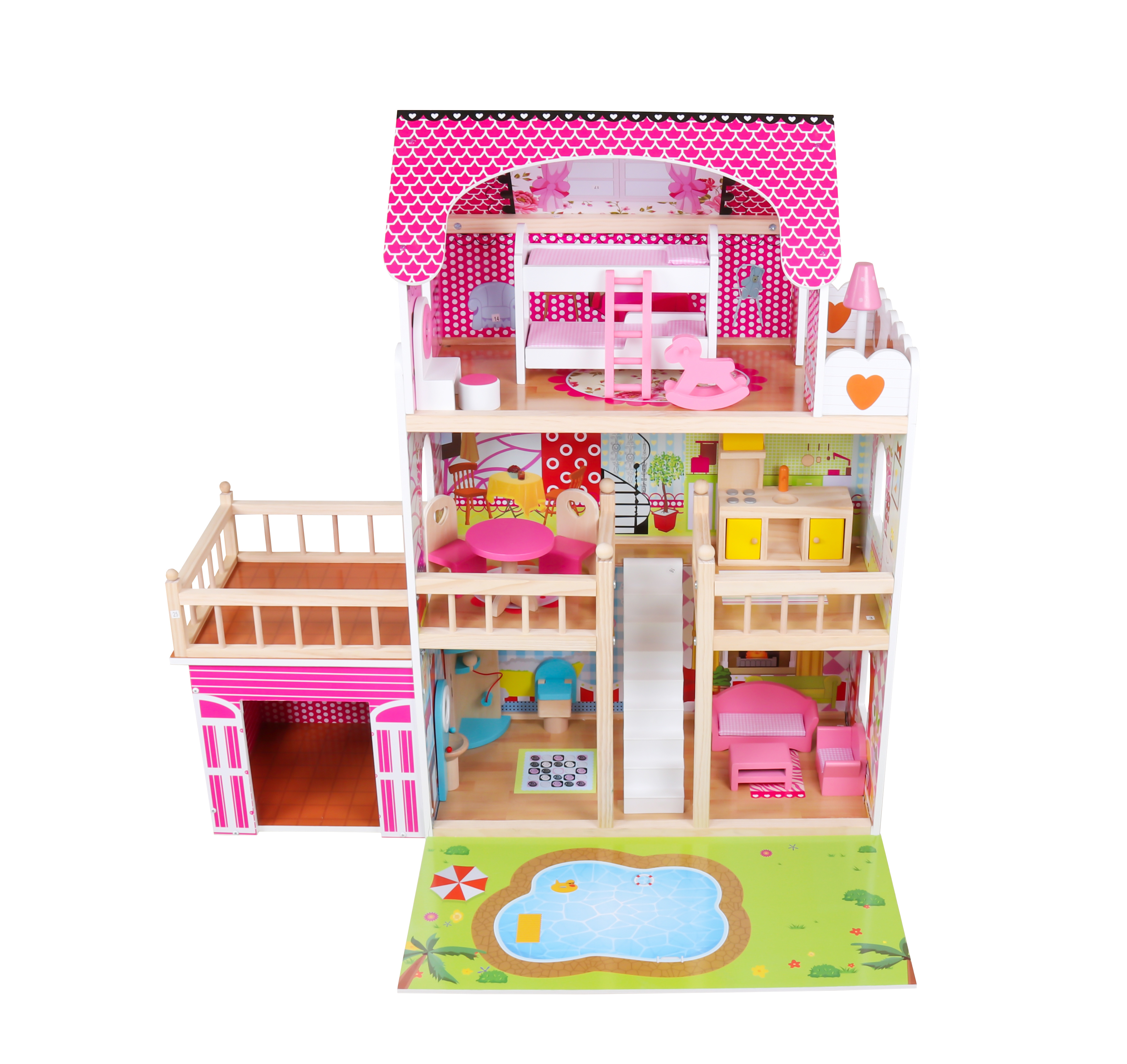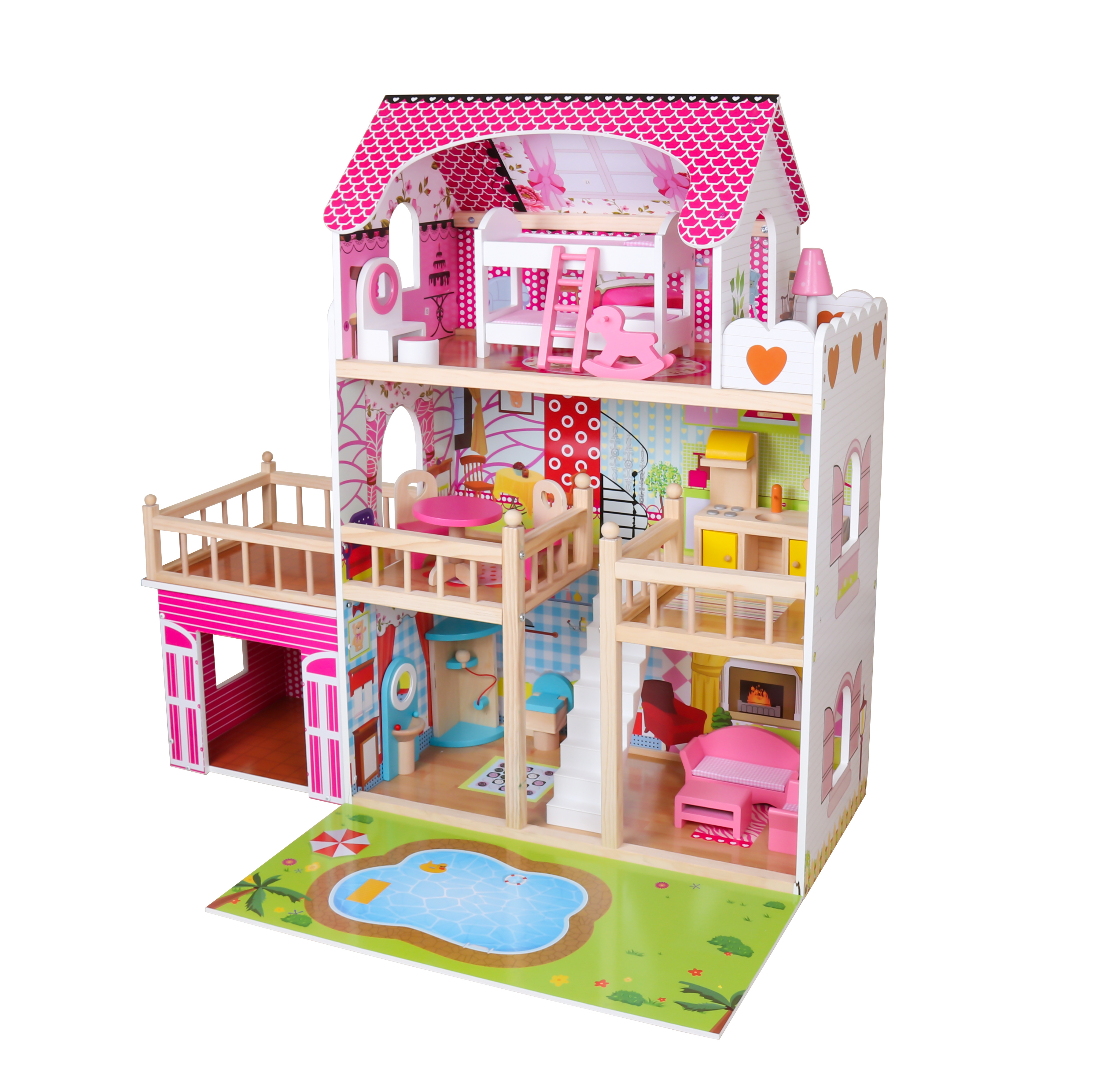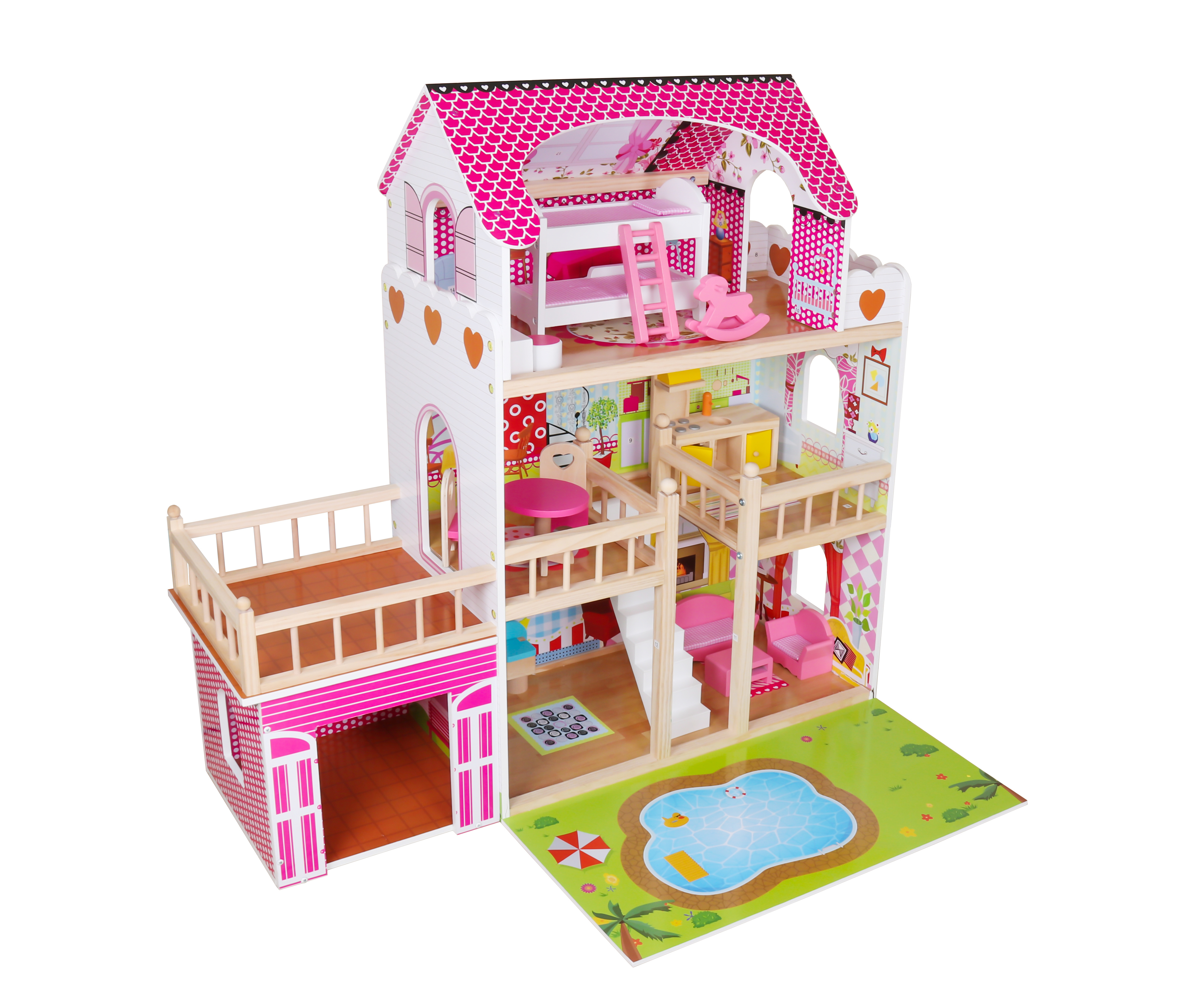 Das Puppenhaus ist aus hochwertigem Holz mit viel Liebe zum Detail und höchster Verarbeitungsqualität gefertigt. Es wurde auch darauf geachtet, scharfe Kanten zu entfernen, die für die Sicherheit Ihres Kindes unerlässlich sind.