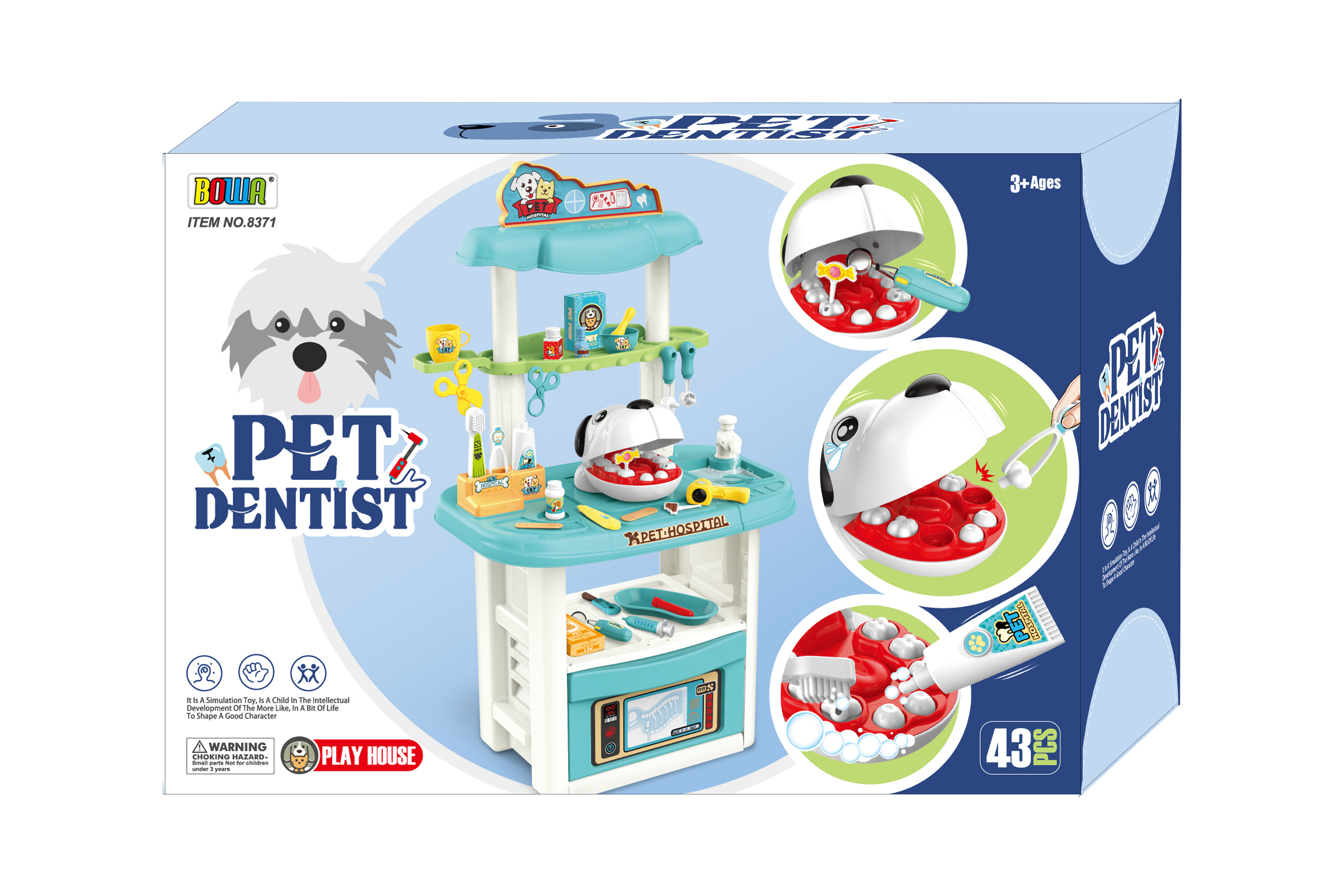 Dank des Sets findet sich das Kind in der Rolle eines Zahnarztes wieder. Es ist seine Aufgabe, das gesamte Gebiss seines Patienten, in diesem Fall eines Hundes, sorgfältig zu überprüfen.