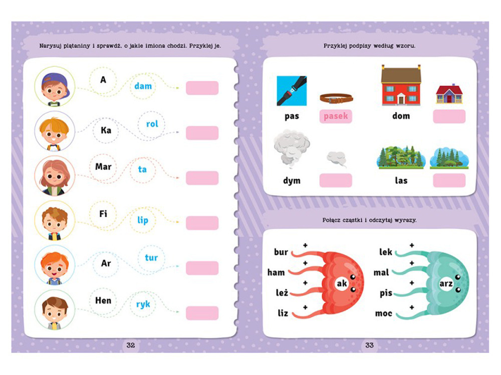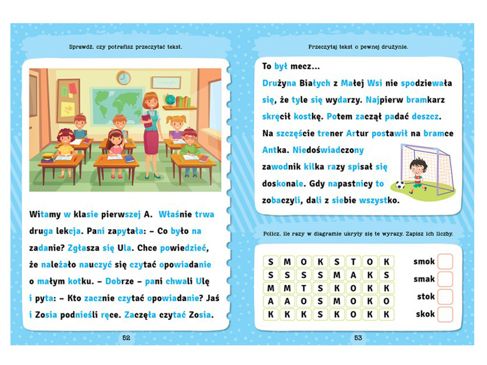 - Różnorodne zadania – od łamigłówek z grupami wyrazów po krótkie czytanki – przyciągną i zainteresują małych czytelników.