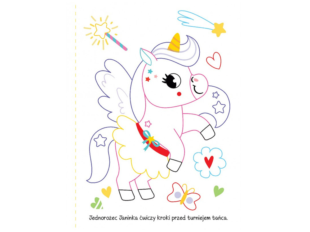 Zanurz się w magicznym świecie kolorów i blasku! Ten wyjątkowy zestaw to prawdziwa gratka dla małych artystów, którzy kochają jednorożce i wszystko, co się świeci. W środku znajdziesz 12 uroczych ilustracji z kolorowym obrysem, które można pokolorować i ozdobić ponad 1000 naklejkowych diamencików w różnych barwach.