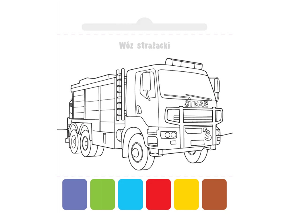 Perforacja umożliwia łatwe wyrywanie rysunków, które można później oprawić lub podarować jako własnoręczne dzieło. W malowance znajdują się różnorodne pojazdy, m.in.: wóz strażacki, motocykl ścigacz, monster truck, samochód sportowy, dżip terenowy, traktor, kamper, walec, czołg, autokar i wiele innych.