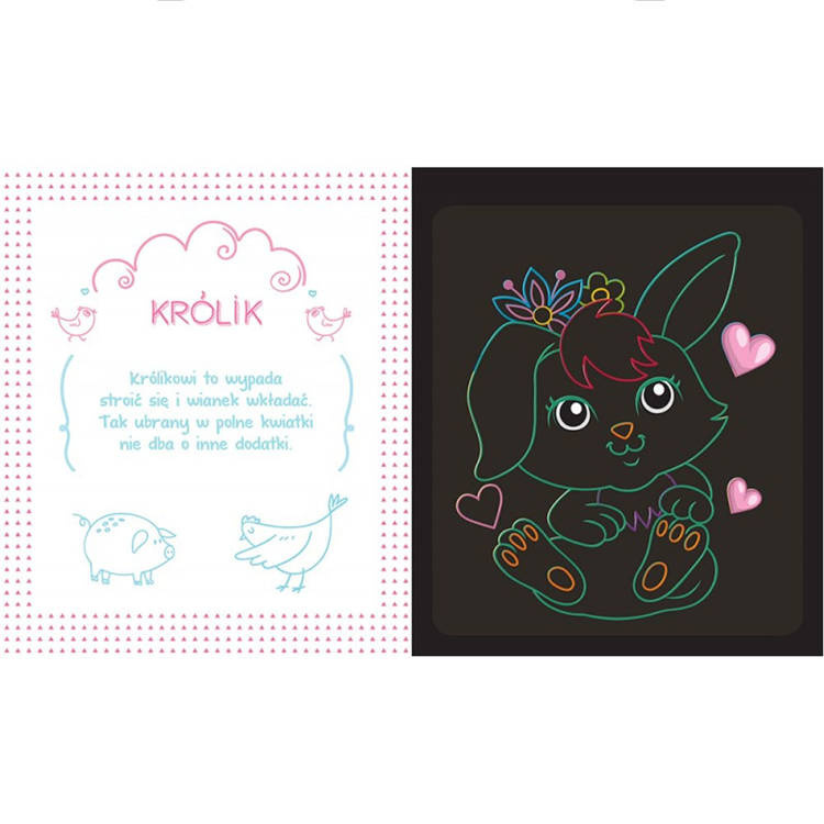 Użyj rysika jak magicznej różdżki, a na pokrytych czernią stronach wyczarujesz kolorowy świat zwierząt, pojazdów i bajkowych postaci.