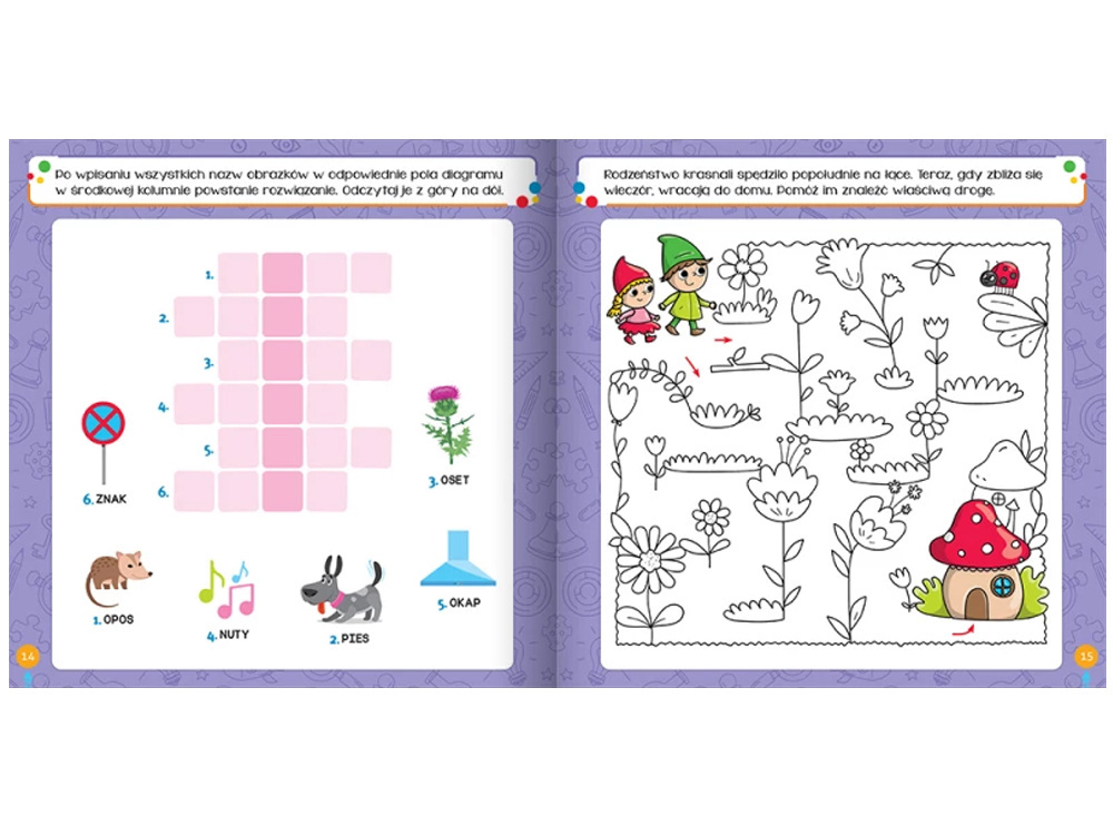 Książeczka stworzona z myślą o ciekawych świata pięciolatkach! Zawiera różnorodne i zabawne łamigłówki, takie jak krzyżówki, labirynty, łączenie punktów, ukryte hasła i obrazki oraz wiele innych zadań dopasowanych do możliwości dziecka.