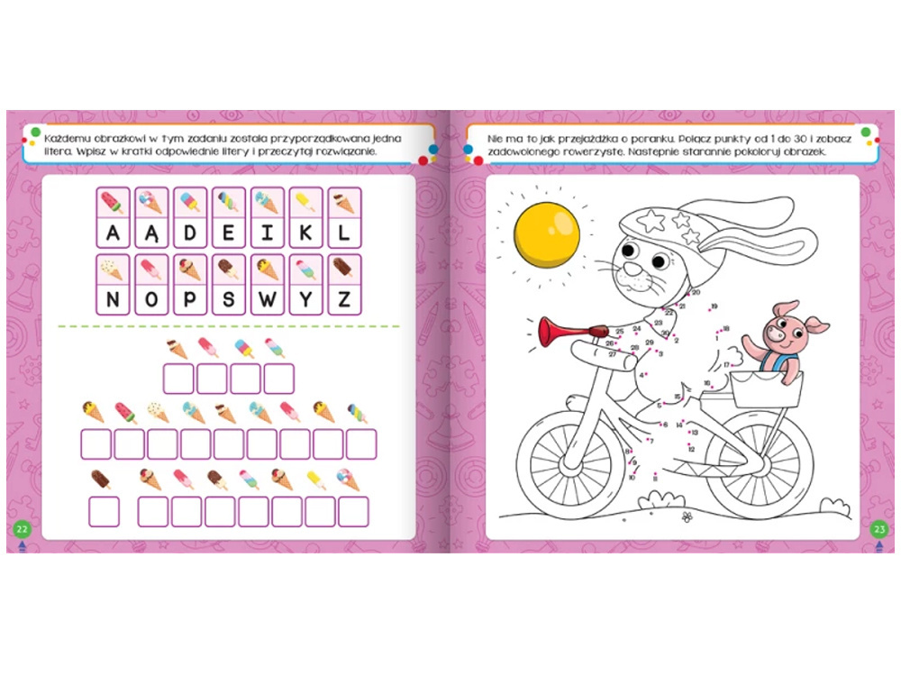Ta książeczka to doskonała propozycja dla ciekawych świata sześciolatków! Zawiera różnorodne i pomysłowe łamigłówki dostosowane do wieku dziecka – krzyżówki, labirynty, łączenie punktów, ukryte hasła i obrazki, a także wiele innych angażujących zadań.