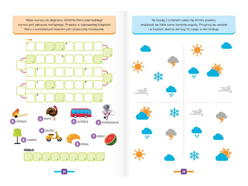 „Łamigłówki na słońce i na deszcz” gwarantują dzieciom przyjemny i rozwijający sposób spędzania czasu oraz wzbogacają ich wiedzę. Z tą książką dzieci: poćwiczą pisanie, umiejętność liczenia i logiczne myślenie, poznają polskie przysłowia związane z pogodą, zaczną wykonywać proste instrukcje oraz rozwiną sprawność manualną.