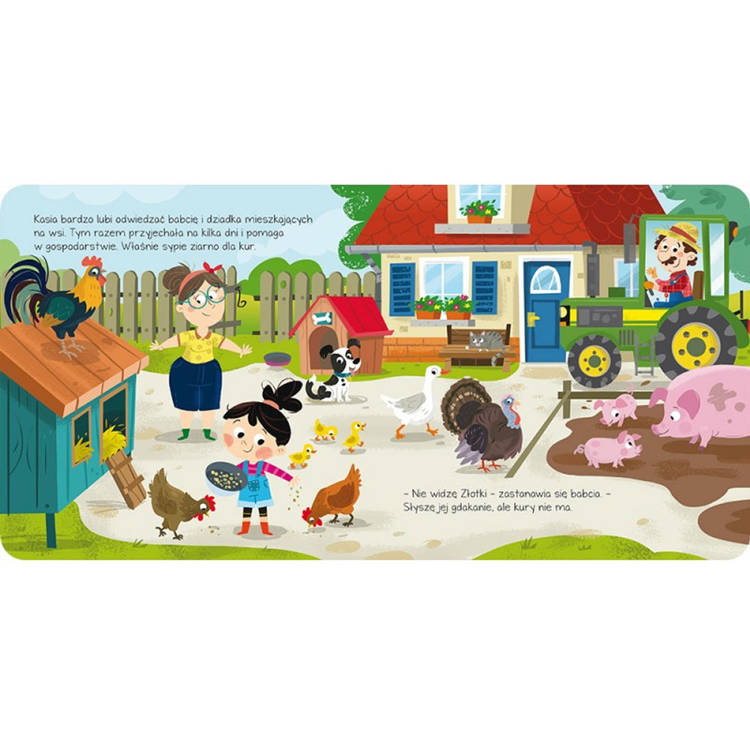 Wyprawa na wieś inna niż zwykle – z podwórka zniknęła kura Złotka. Poszukamy jej razem? Wytężamy słuch, zaglądamy do różnych kryjówek i podążamy za odgłosem „ko, ko, ko”.