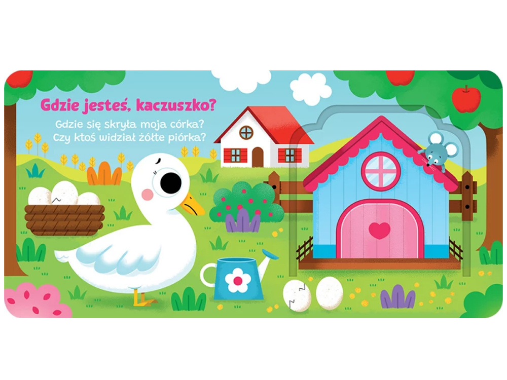 Czas na wesołą przygodę na wsi! Ta urocza, interaktywna książeczka zachęca najmłodszych do wspólnej zabawy w odkrywanie zwierząt z wiejskiej zagrody. Mama kaczka szuka swojej małej kaczuszki, a za każdym okienkiem kryją się inni mieszkańcy gospodarstwa – kury, świnka, krowa, kotek i oczywiście… zaginiona kaczuszka!