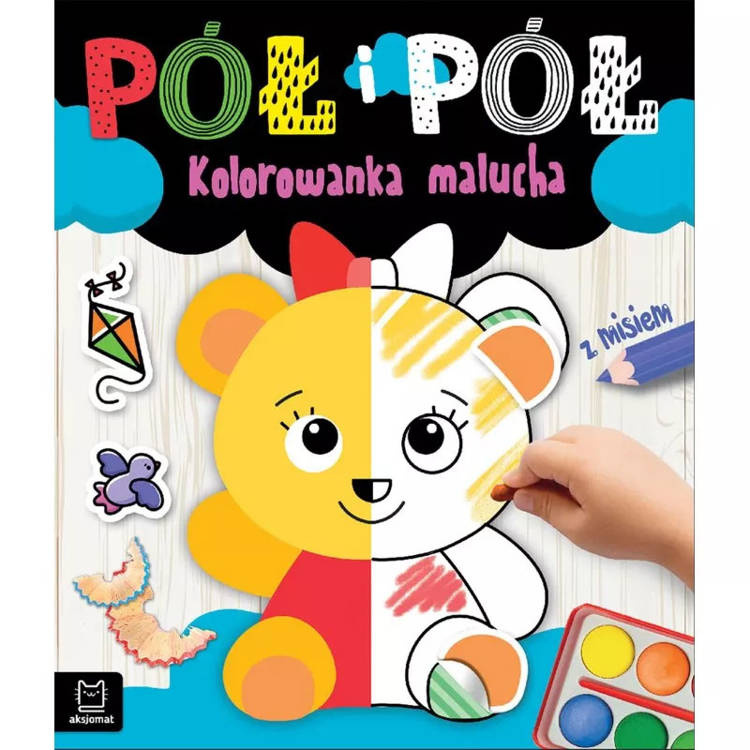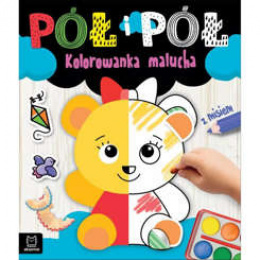 Pół i pół. Kolorowanka malucha z misiem to seria nowatorskich książeczek, w której dziecko, kolorując tylko połowę obrazka, intuicyjnie stosuje zasady symetrii, rozwija spostrzegawczość i uczy się odwzorowywać kolory. Obrazki w tych kolorowankach są starannie opracowane i mają niewielką liczbę szczegółów, by to pierwsze ćwiczenie manualne nie męczyło, a zachęcało i sprawiało radość. Ciekawa tematyka rysunków oraz naklejki gwarantują maluszkom udaną zabawę.