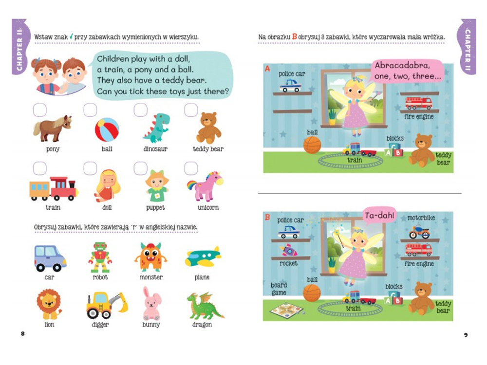 Dzieci nauczą się nazw zwierząt, mebli, zabawek, pojazdów, ubrań oraz produktów spożywczych. Czekają na nich ciekawe zadania i zagadki. Dzięki takim ćwiczeniom dzieci poprawia wymowę i nauczą się prowadzić proste dialogi.